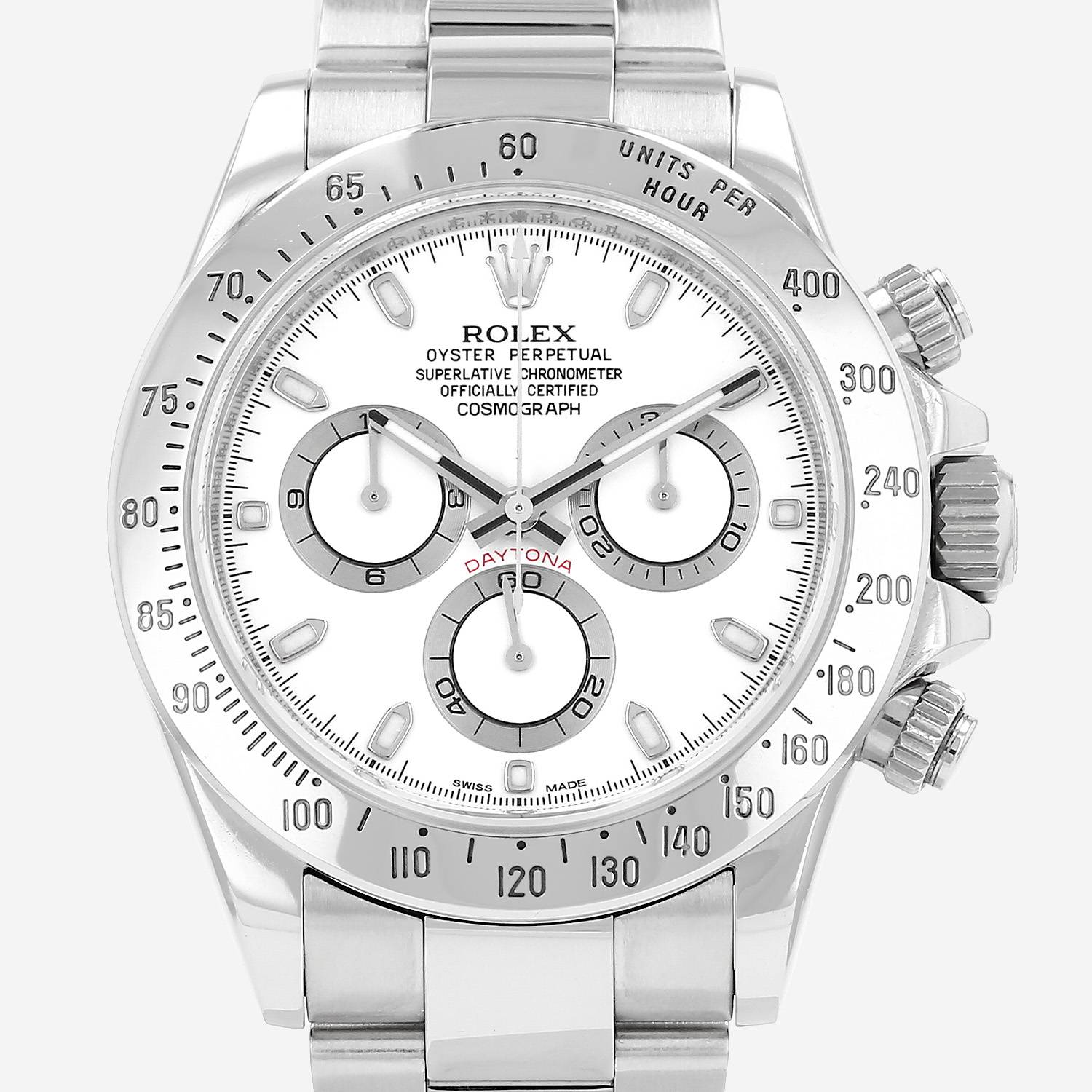Montre bracelet Rolex Daytona Automatique en acier. Boitier rond en acier, fond vissé, poussoirs vissés, à 2h et 4h, lunette graduée, couronne vissée.