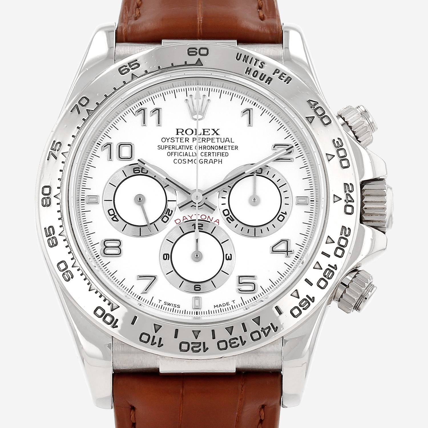 Montre bracelet Rolex Daytona Automatique en or blanc. Boitier rond en or blanc, fond vissé, poussoirs vissés, à 2h et 4h, lunette graduée échelle tachymétrique, couronne vissée.