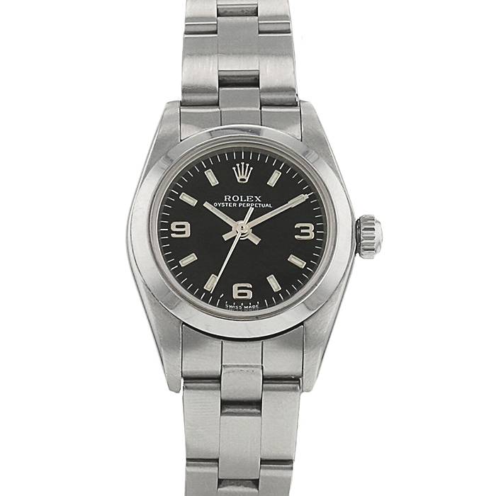 Montre bracelet de dame Rolex Lady Oyster Perpetual en acier. Boitier rond en acier, fond vissé, couronne vissée.