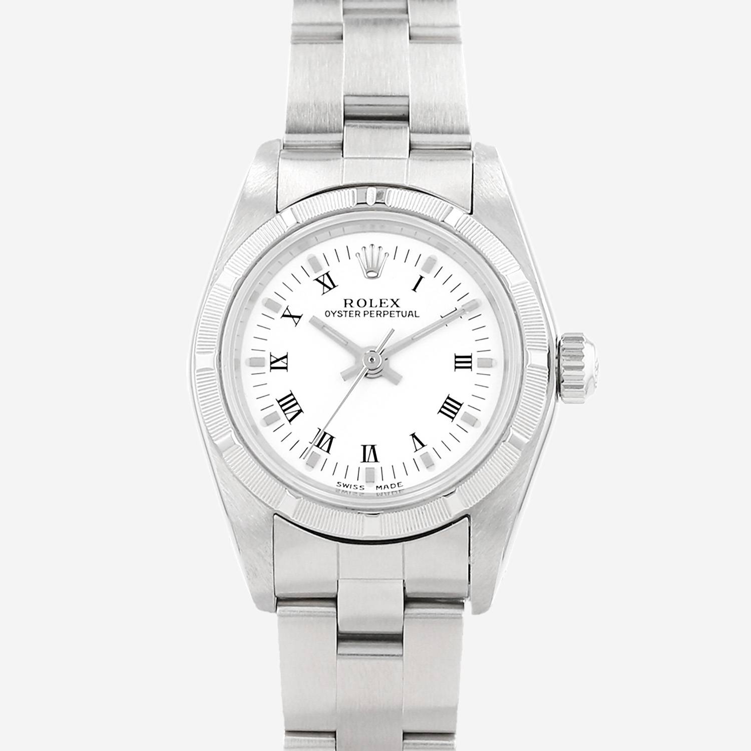 Montre bracelet Rolex Lady Oyster Perpetual en acier. Boitier rond en acier, fond vissé, lunette semi-striée en acier, couronne vissée.
