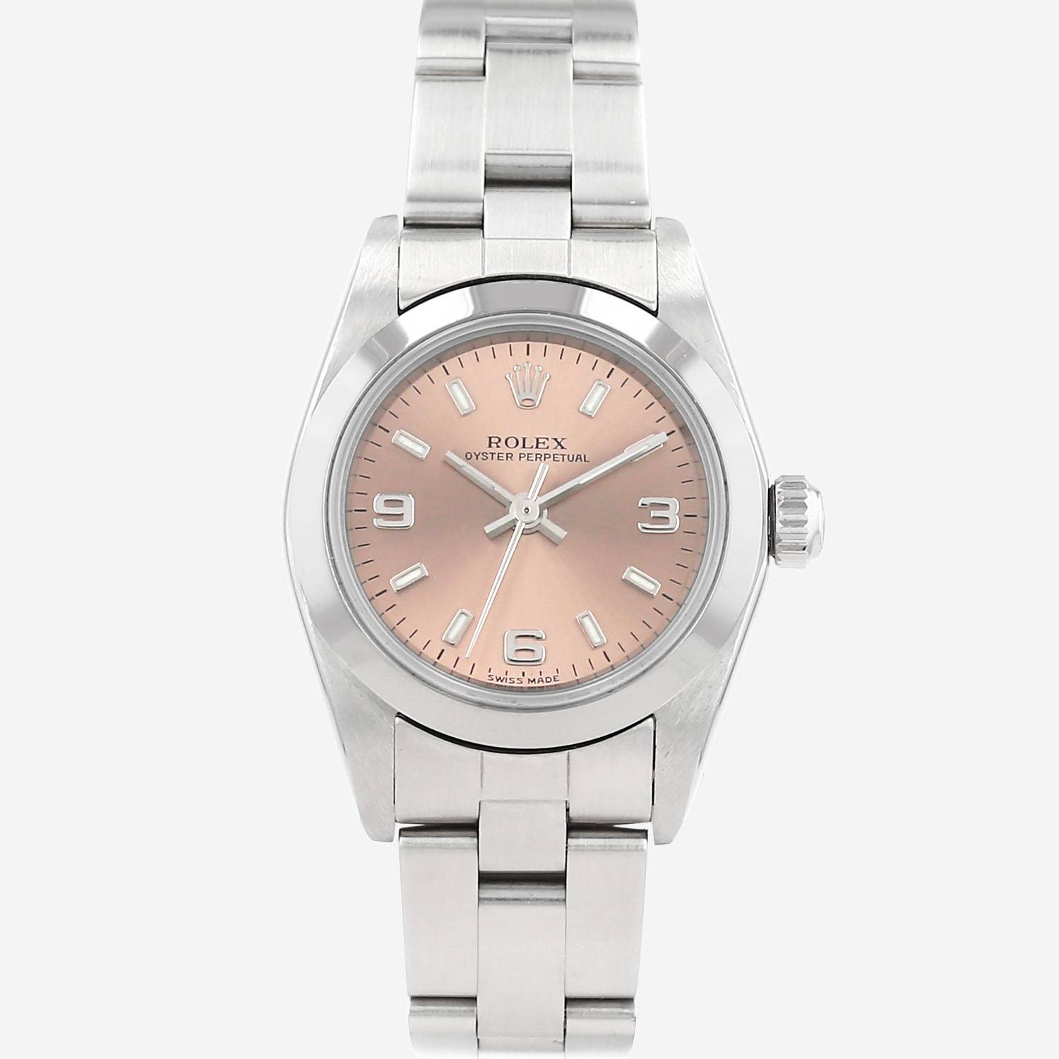 Montre bracelet Rolex Lady Oyster Perpetual en acier. Boitier rond en acier, fond vissé, lunette lisse, couronne vissée.
