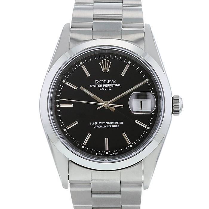 Montre bracelet Rolex Oyster Perpetual Date en acier. Boitier rond en acier, fond vissé, lunette lisse en acier, couronne cannelée.