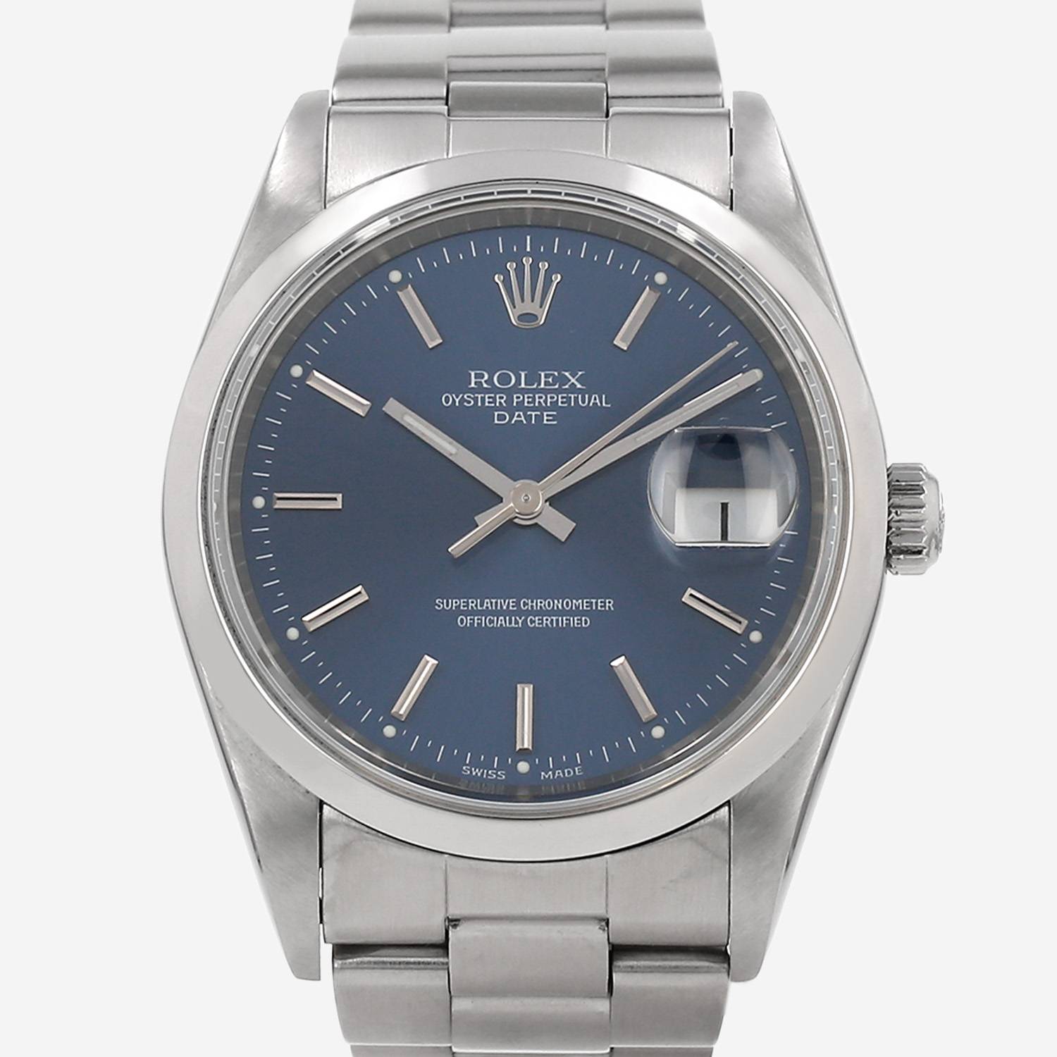 Montre bracelet Rolex Oyster Perpetual Date en acier. Boitier rond en acier, fond vissé, lunette lisse, couronne vissée.
