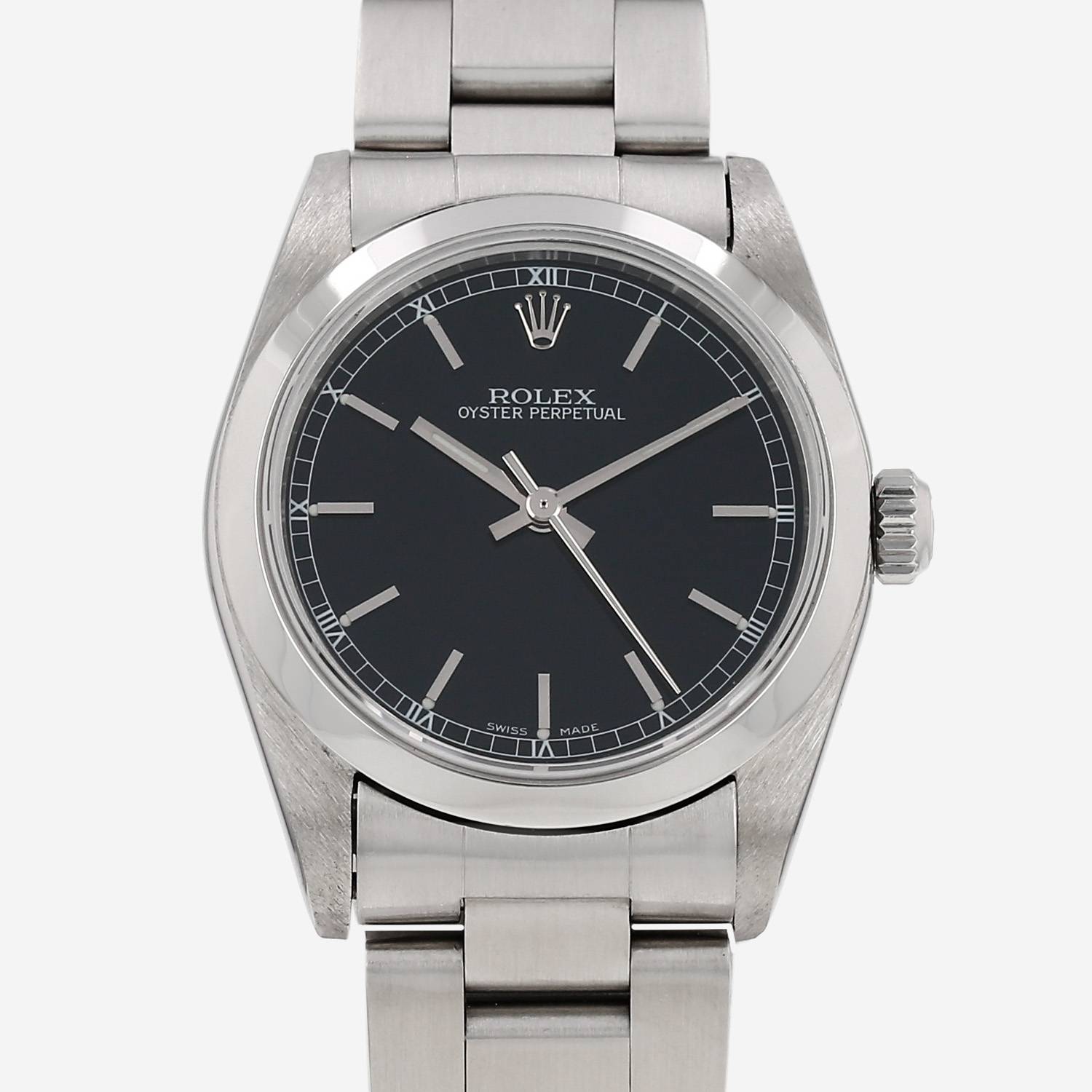 Montre bracelet Rolex Oyster Perpetual en acier. Boitier rond en acier, fond vissé, lunette lisse, couronne vissée.