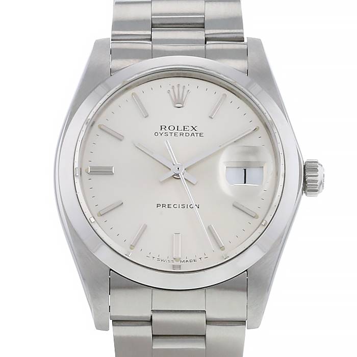 Montre bracelet Rolex Oyster Date Precision en acier. Boitier rond en acier, fond vissé, lunette lisse en acier, couronne vissée.