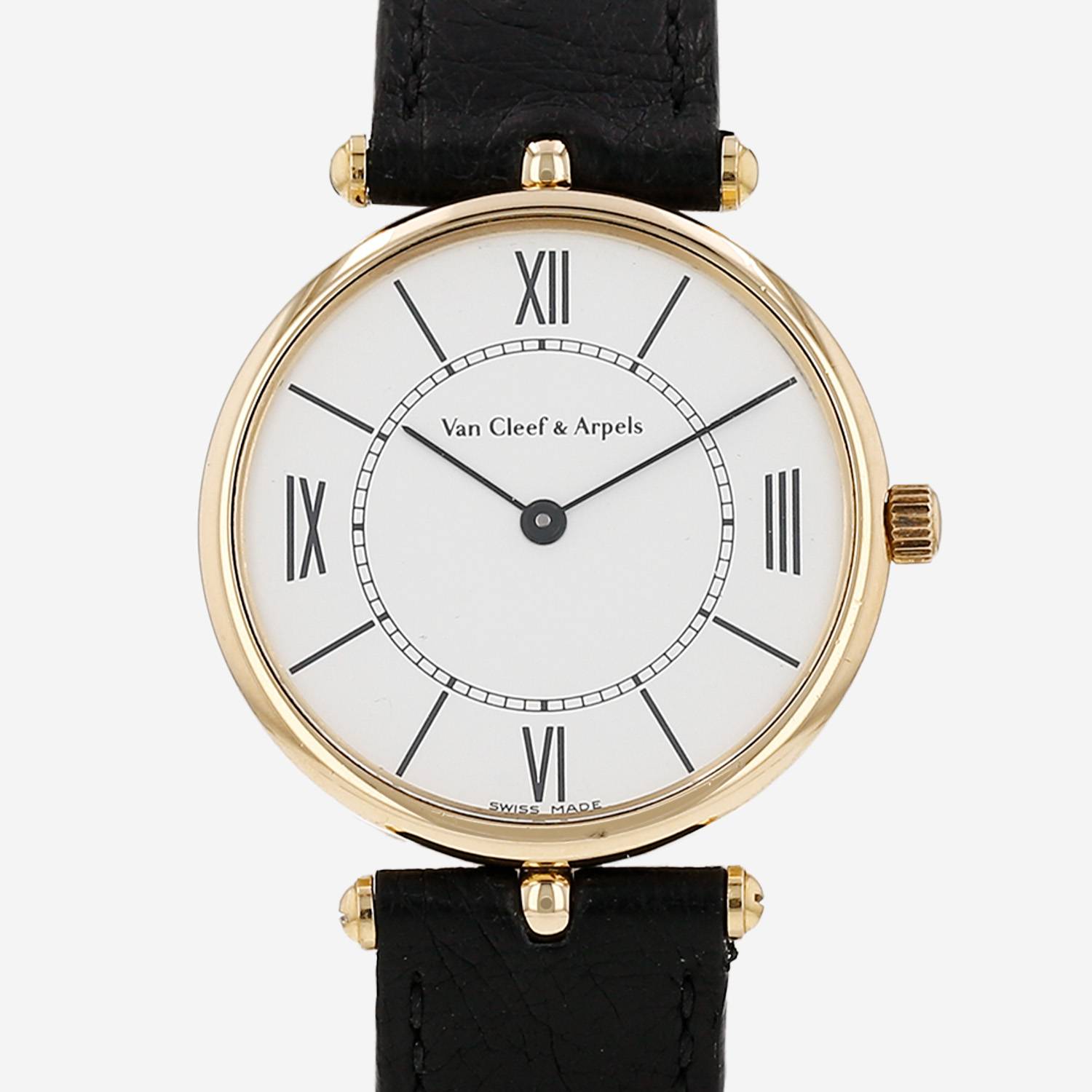 Montre bracelet Van Cleef & Arpels Pierre Arpels en or jaune. Boitier rond en or jaune, fond clippé, couronne cannelée.