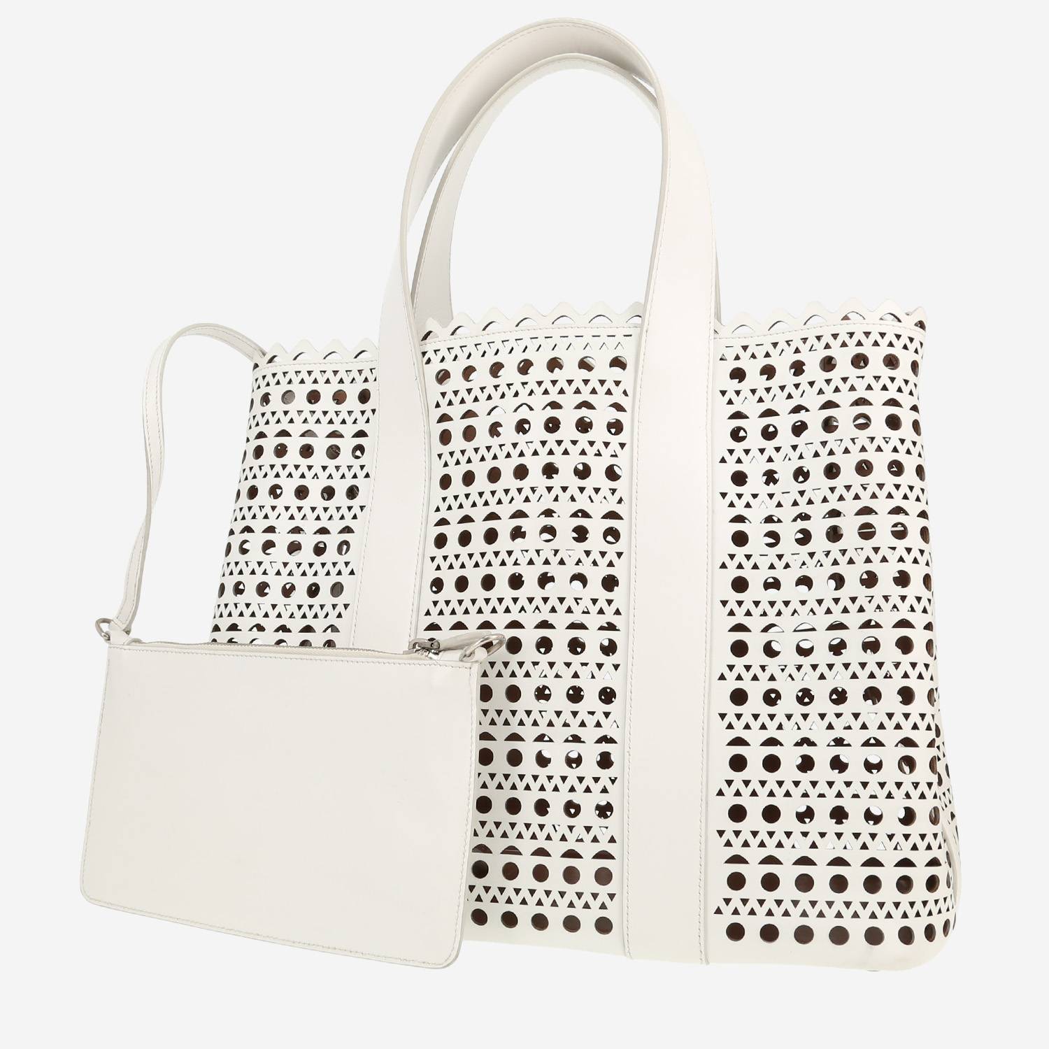 Magnifique sac à main Alaïa Mina en cuir ajouré blanc à motif de dentelle, garniture en métal argenté, double poignée en cuir blanc permettant un porté main.
