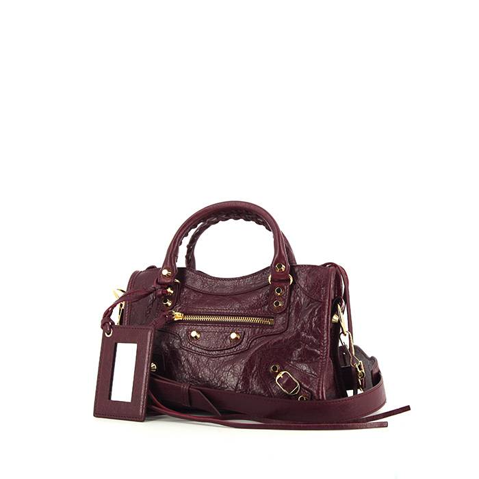 Délicieux sac bandoulière Balenciaga City Cross en cuir prune, garniture en métal doré, double poignée en cuir prune à motif de tressage, anse bandoulière amovible réglable en cuir prune permettant un porté main ou épaule ou bandoulière.