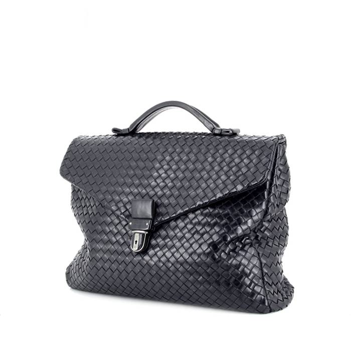 Élégant porte-documents en cuir intrecciato noir, garniture en métal argenté, poignée simple en cuir noir permettant un porté main.