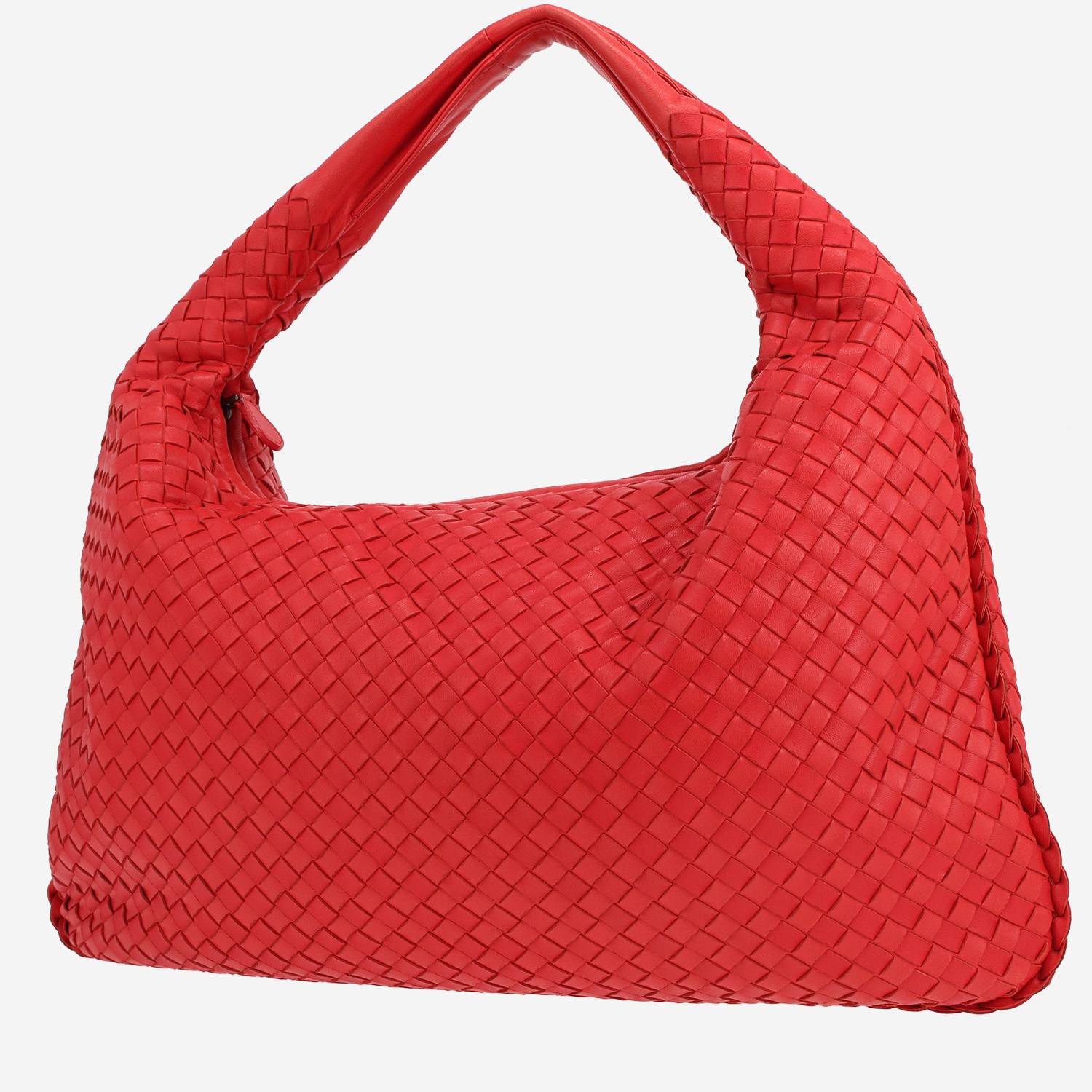 Magnifique sac à main Bottega Veneta Veneta en cuir intrecciato rouge, garniture en métal argenté noirci, une anse en cuir rouge permettant un porté main ou épaule.