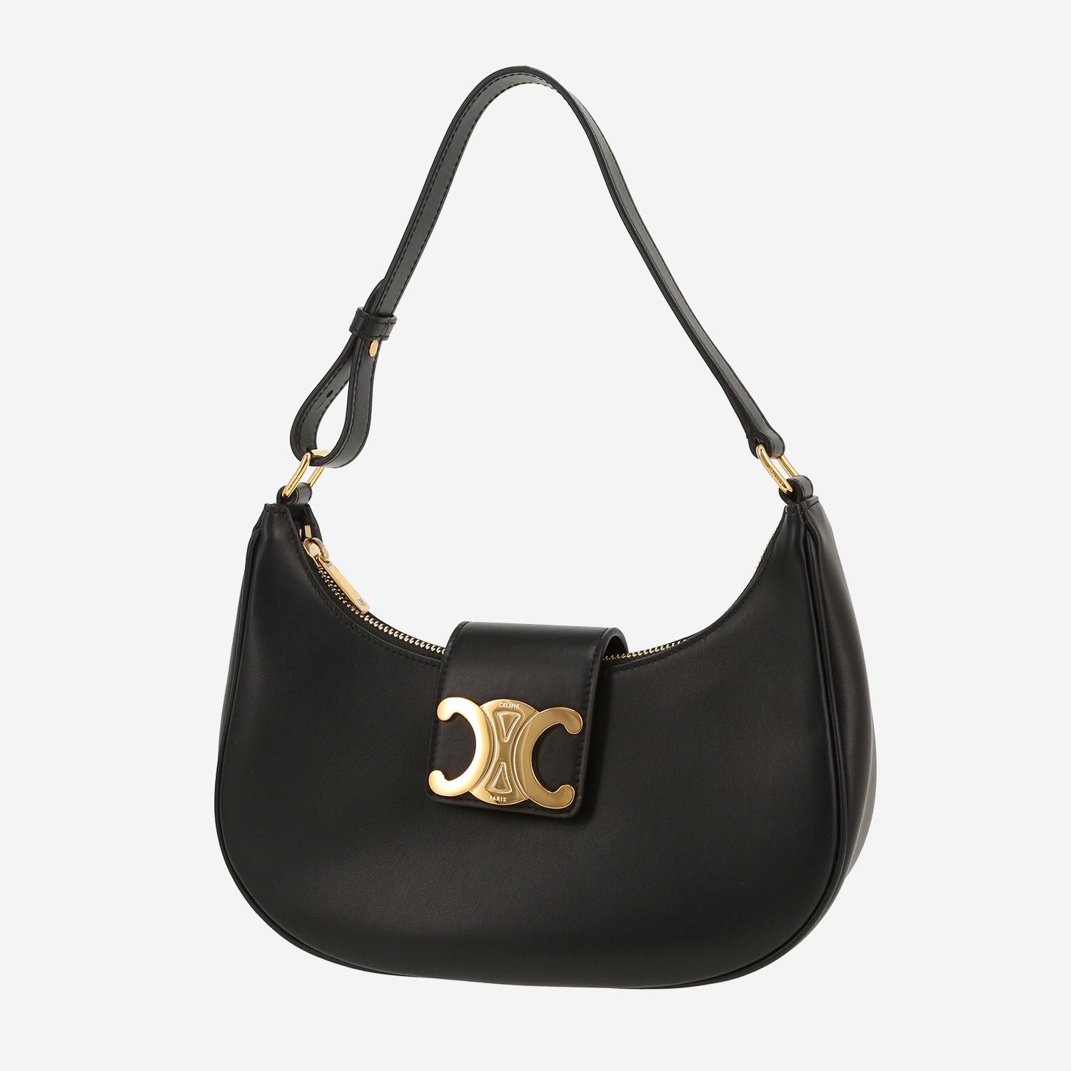 Magnifique sac à main Celine Ava Triomphe en cuir noir, garniture en métal doré, une anse en cuir noir permettant un porté main ou épaule.