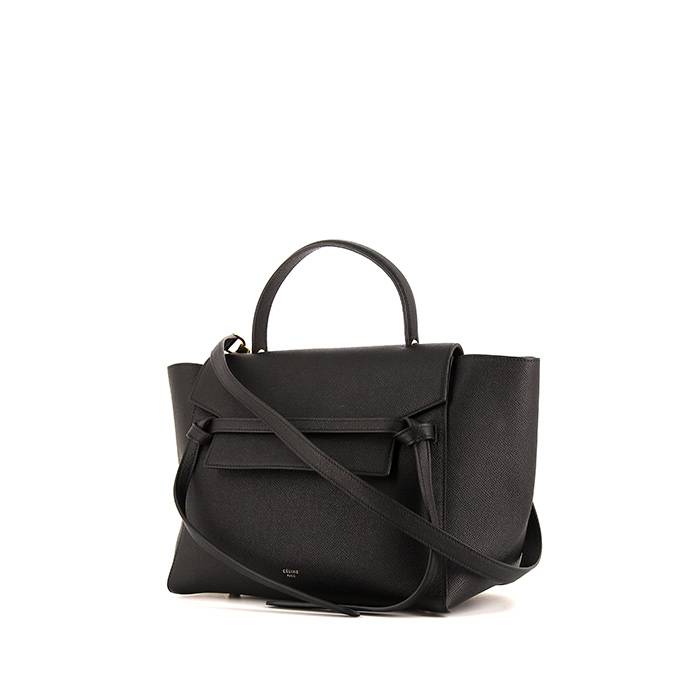Charmant sac à main Celine Belt moyen modèle en cuir grainé noir, garniture en métal doré, poignée simple en cuir noir, anse amovible en cuir noir permettant un porté main ou épaule.