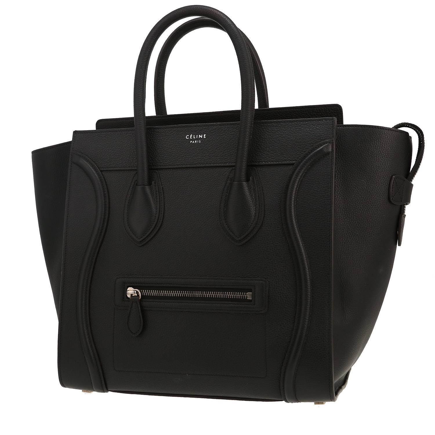 Incontournable sac à main Celine Luggage mini en cuir grainé noir, garniture en métal argenté, double poignée en cuir noir permettant un porté main.