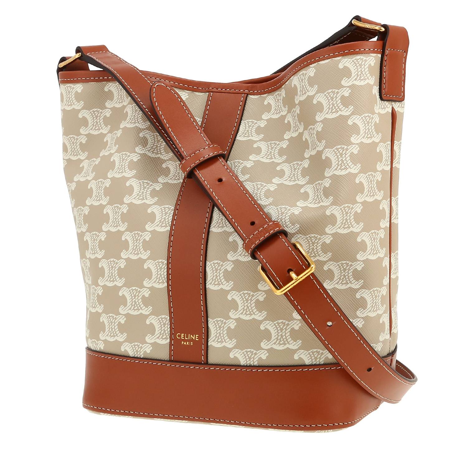 Élégant sac bandoulière Celine Seau petit modèle en toile Triomphe beige et cuir marron, garniture en métal doré, une anse bandoulière ajustable en cuir marron permettant un porté épaule ou bandoulière.