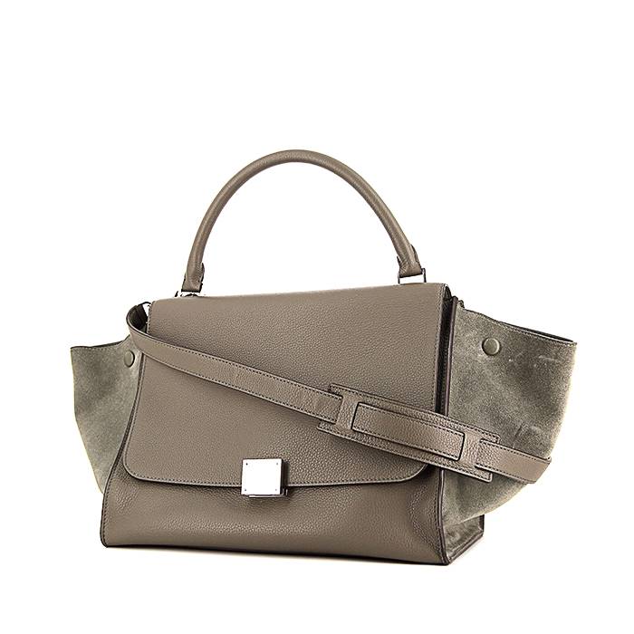 Important sac à main Celine Trapeze moyen modèle en cuir gris et daim gris, garniture en métal argenté, poignée simple en cuir gris, anse détachable en cuir gris permettant un porté main ou épaule.