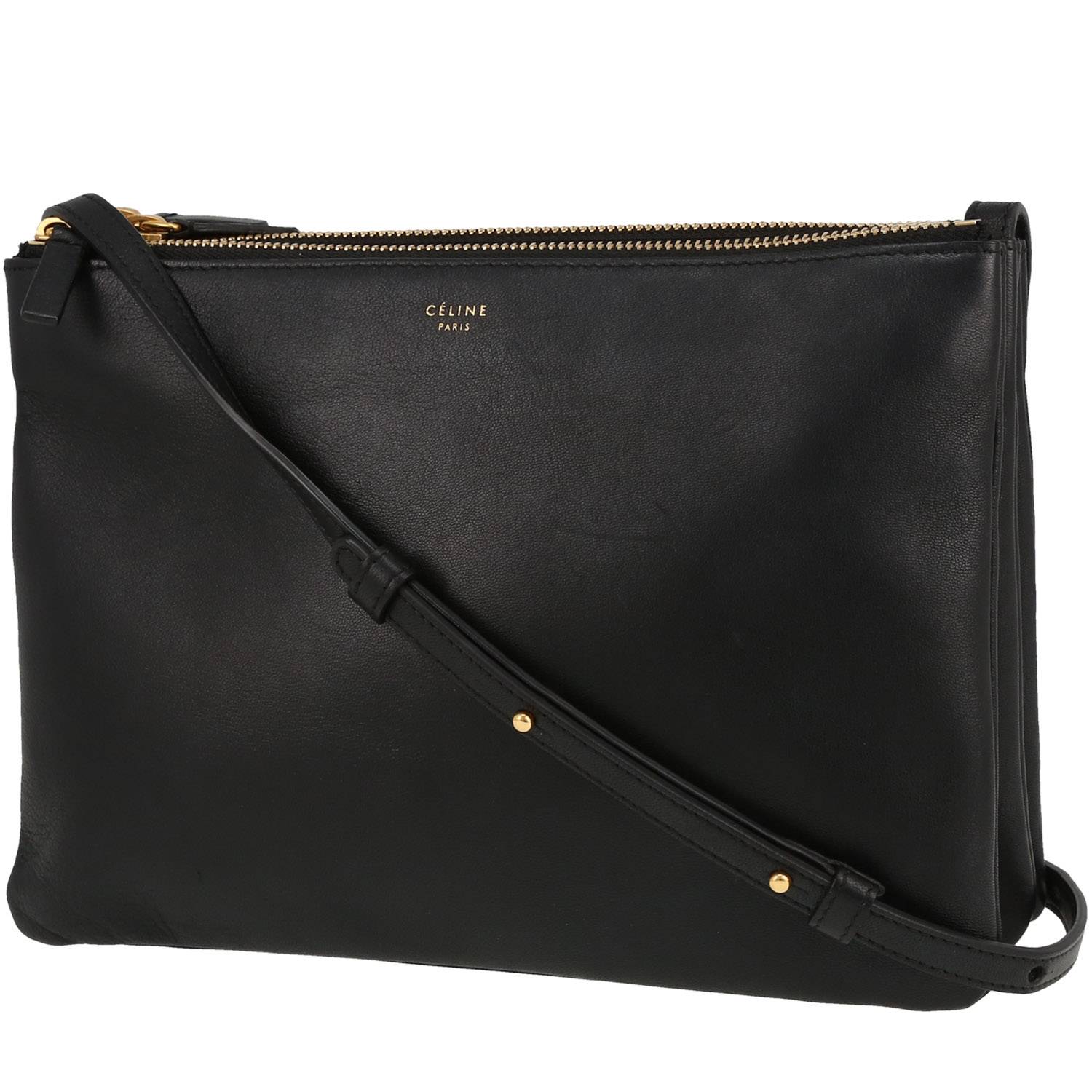 Magnifique sac bandoulière Celine Trio en cuir noir, garniture en métal doré, anse bandoulière ajustable sur 3 crans en cuir noir permettant un porté épaule ou bandoulière.