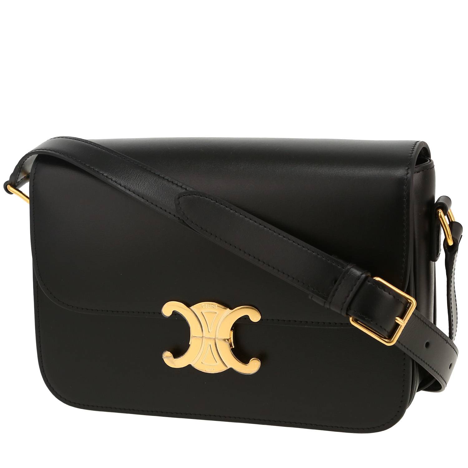 Magnifique sac bandoulière Celine Triomphe en cuir noir, garniture en métal doré, une anse bandoulière réglable en cuir noir permettant un porté épaule ou bandoulière.