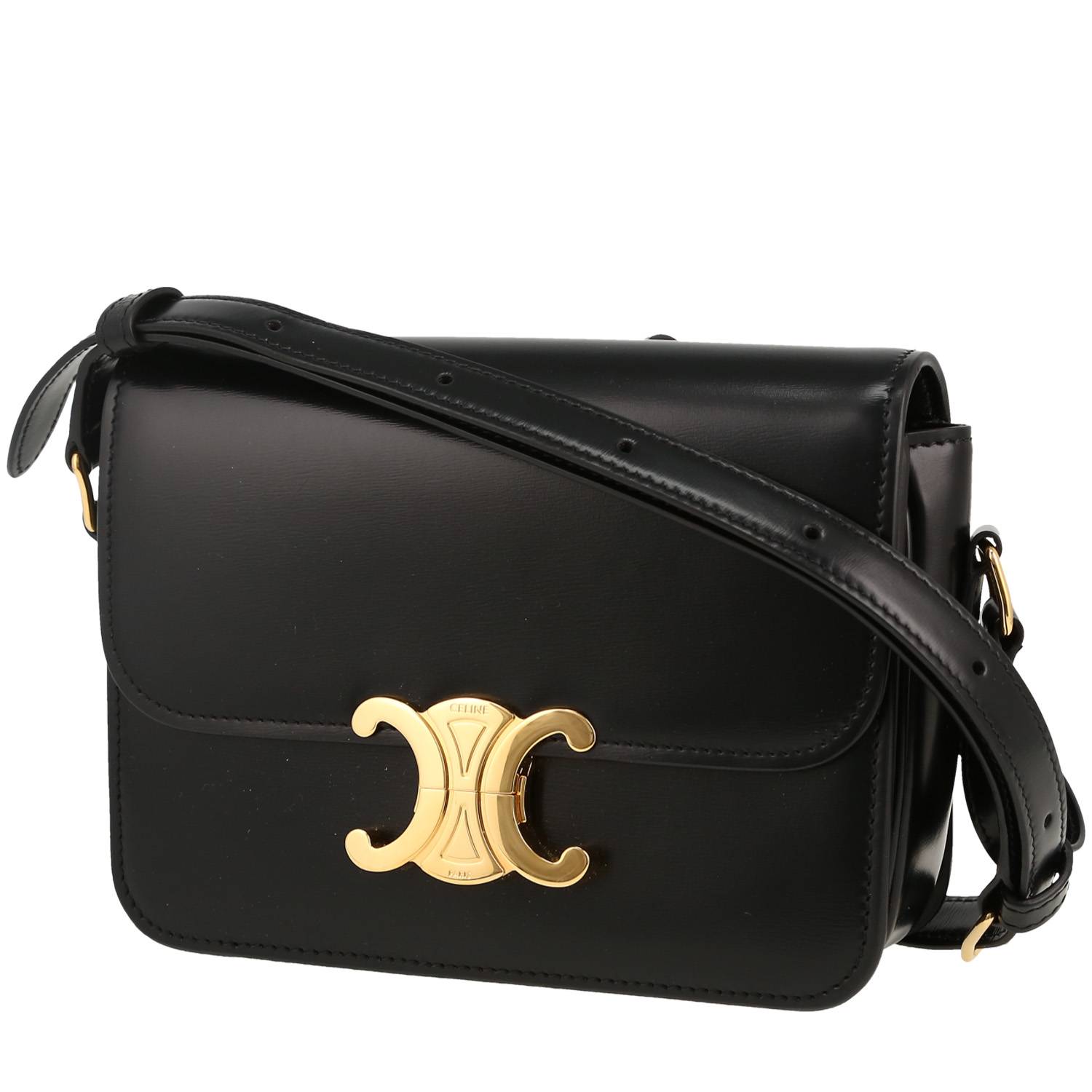 Magnifique sac bandoulière Celine Triomphe Teen en cuir noir, garniture en métal doré, une anse bandoulière en cuir noir permettant un porté main ou épaule ou bandoulière.