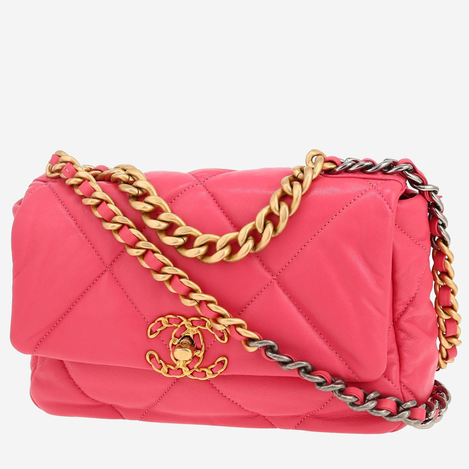 Charmant sac bandoulière Chanel 19 en cuir matelassé rose, garniture en métal doré et argenté, poignée simple en métal doré, une anse-chaine en métal doré et argenté entrelacée de cuir rose permettant un porté main ou épaule ou bandoulière.