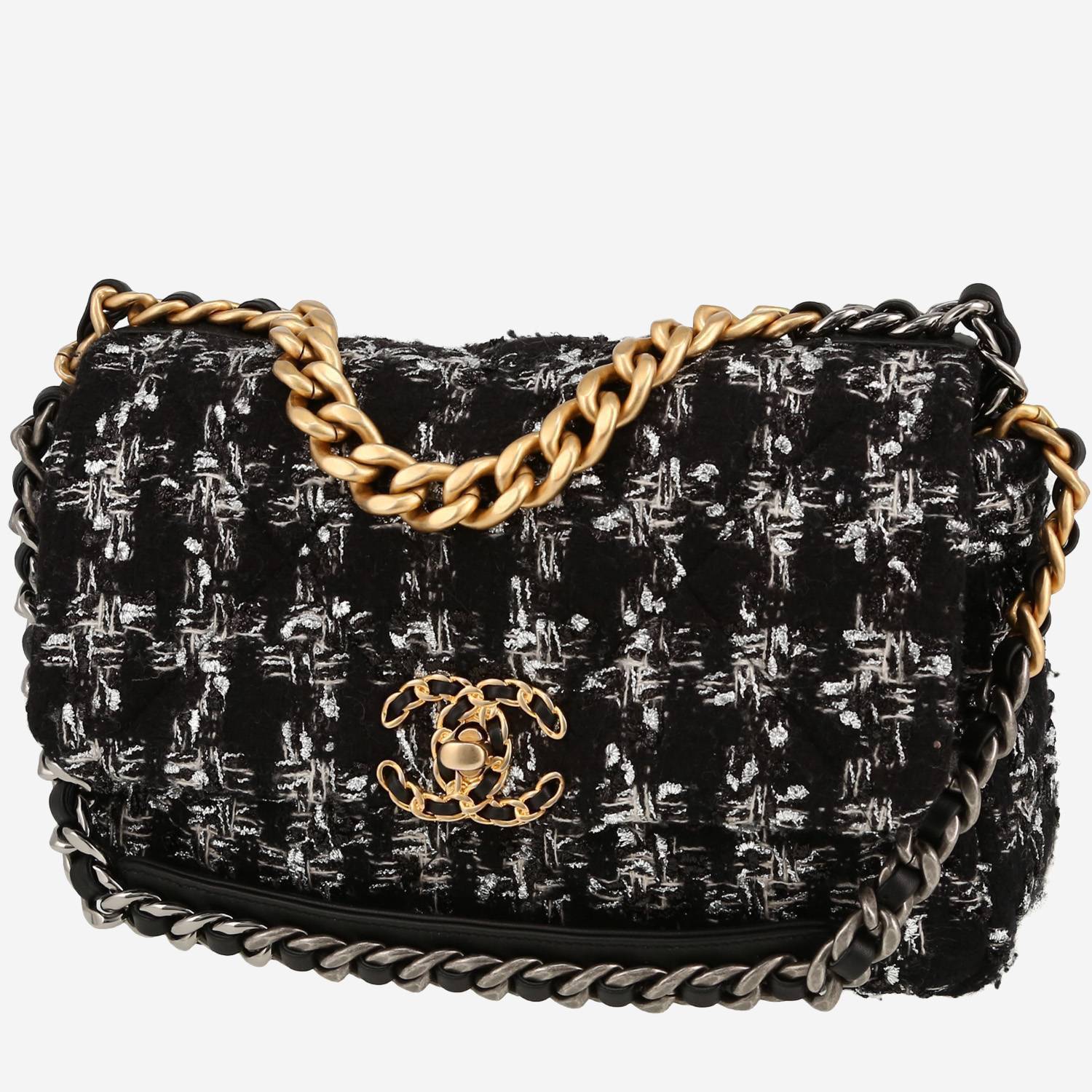 Superbe sac bandoulière Chanel 19 en tweed noir et gris, garniture en métal doré et argenté, poignée en métal doré, une anse-chaine en métal doré et argenté entrelacée de cuir noir permettant un porté main ou épaule ou bandoulière.