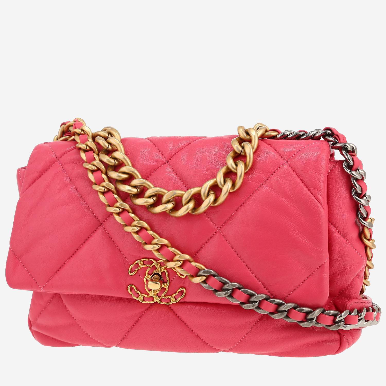 Charmant sac bandoulière Chanel 19 grand modèle en cuir matelassé rose, garniture en métal doré et argenté, poignée en métal doré, une anse-chaine en métal doré et argenté entrelacée de cuir rose permettant un porté main ou épaule ou bandoulière.