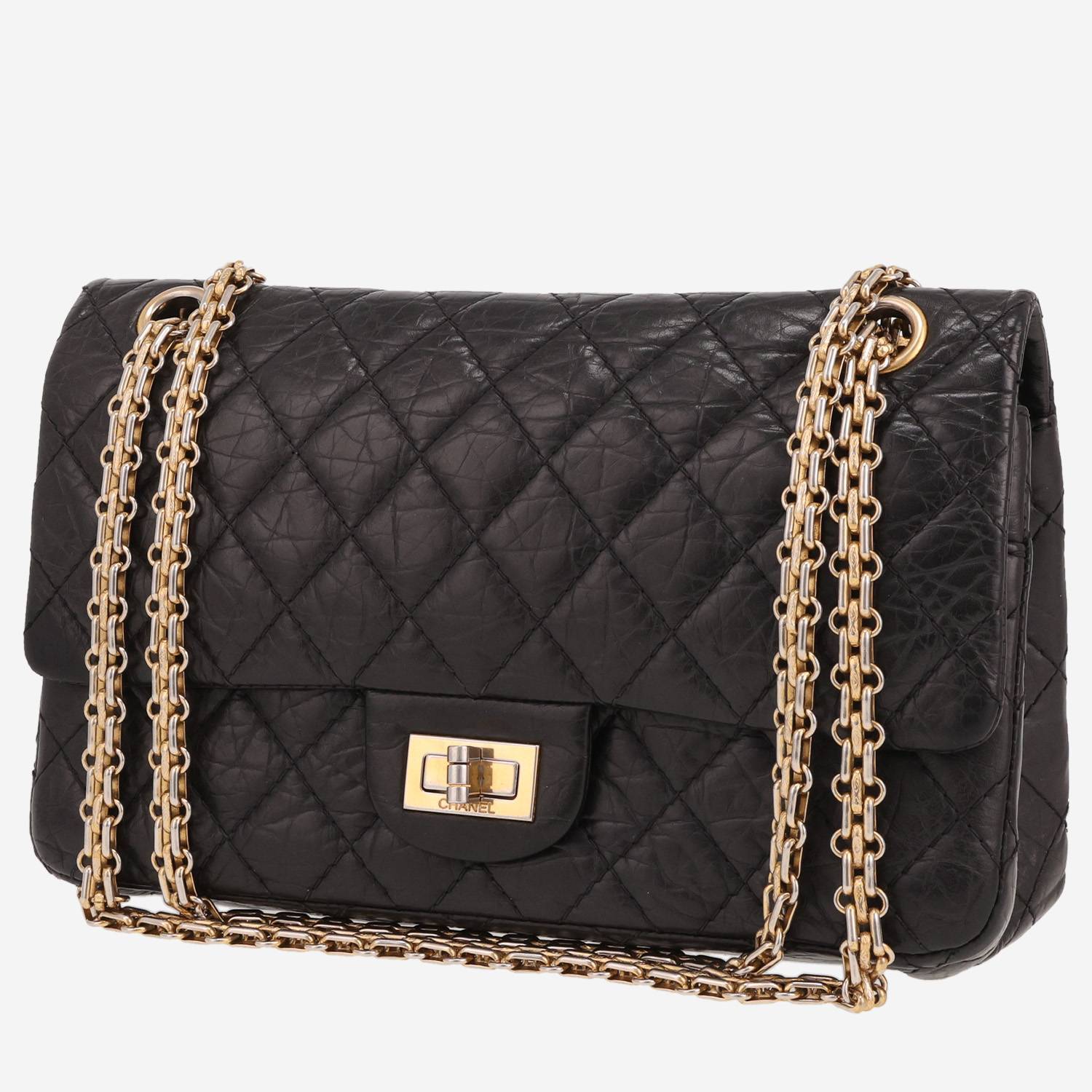 Ravissant sac bandoulière Chanel 2.55 moyen modèle en cuir matelassé noir, garniture en métal doré, une anse-chaine transformable en métal doré permettant un porté main ou épaule ou bandoulière.
