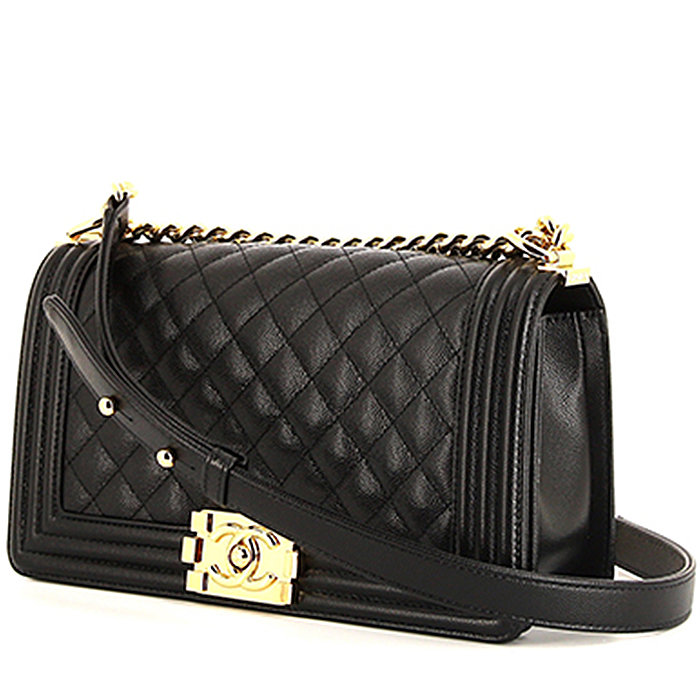 Ravissant sac bandoulière Chanel Boy en cuir grainé matelassé noir, garniture en métal doré, une anse-chaine ajustable en métal doré permettant un porté épaule ou bandoulière.