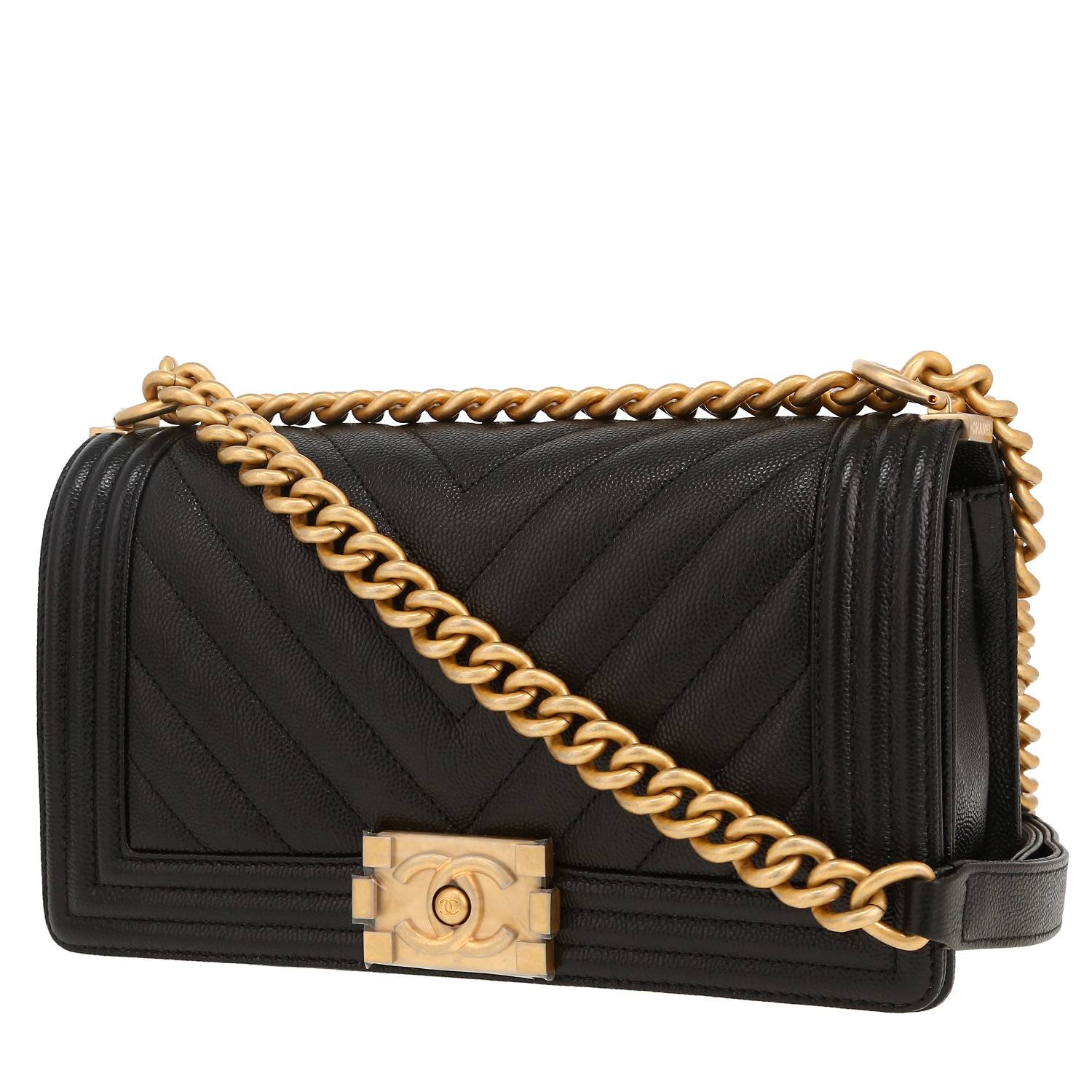 Magnifique sac bandoulière Chanel Boy en cuir grainé matelassé noir à motif de chevrons, garniture en métal doré, une anse-chaine ajustable en métal doré permettant un porté épaule ou bandoulière.