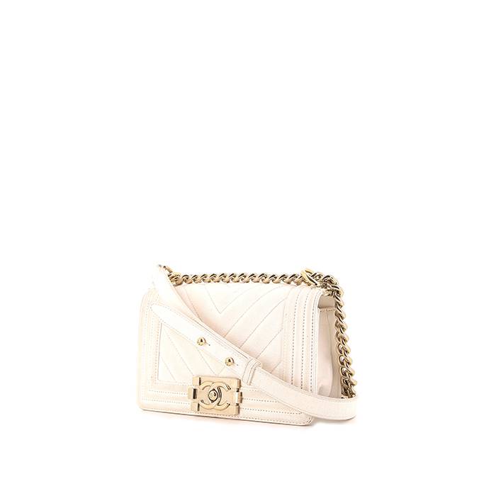 Superbe sac bandoulière Chanel Mini Boy en cuir grainé crème à motif de chevrons, garniture en métal doré, double anse-chaine en métal doré permettant un porté épaule ou bandoulière.