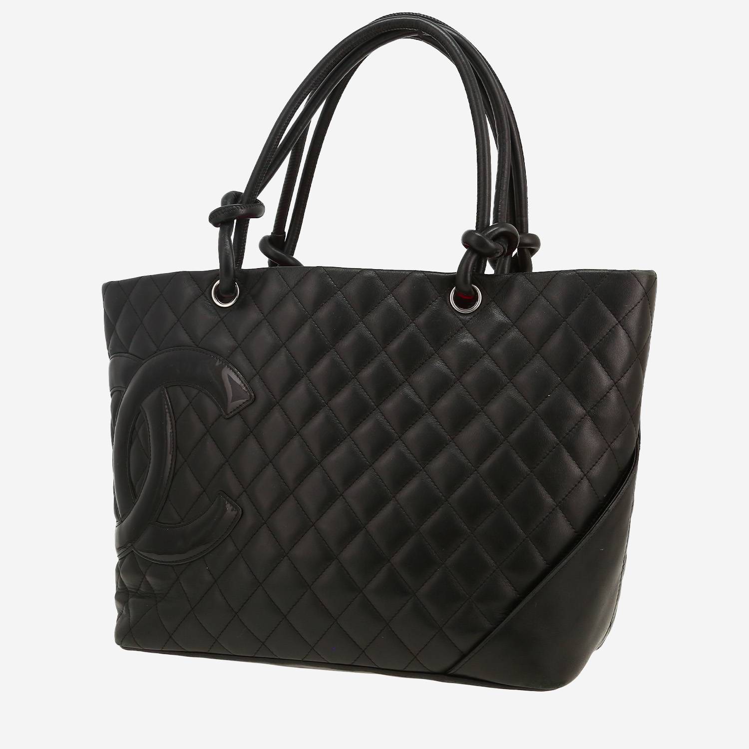Magnifique sac cabas Chanel Cambon en cuir matelassé noir, garniture en métal argenté, double poignée en cuir noir permettant un porté main ou épaule.