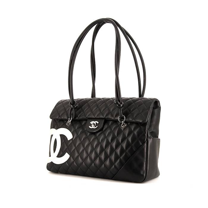 Incontournable sac cabas Chanel Cambon grand modèle en cuir matelassé noir, garniture en métal argenté, double anse en cuir noir permettant un porté main ou épaule.