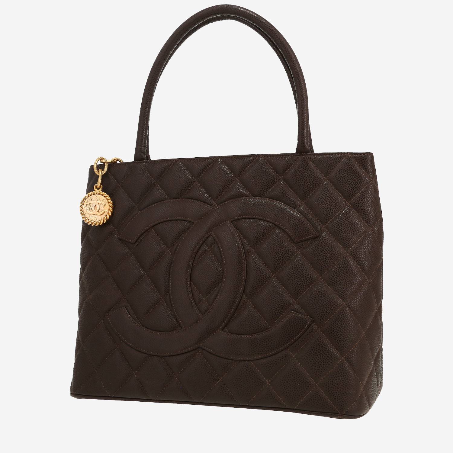Indémodable sac à main Chanel Medaillon en cuir marron, garniture en métal doré, double poignée en cuir marron permettant un porté main ou épaule.