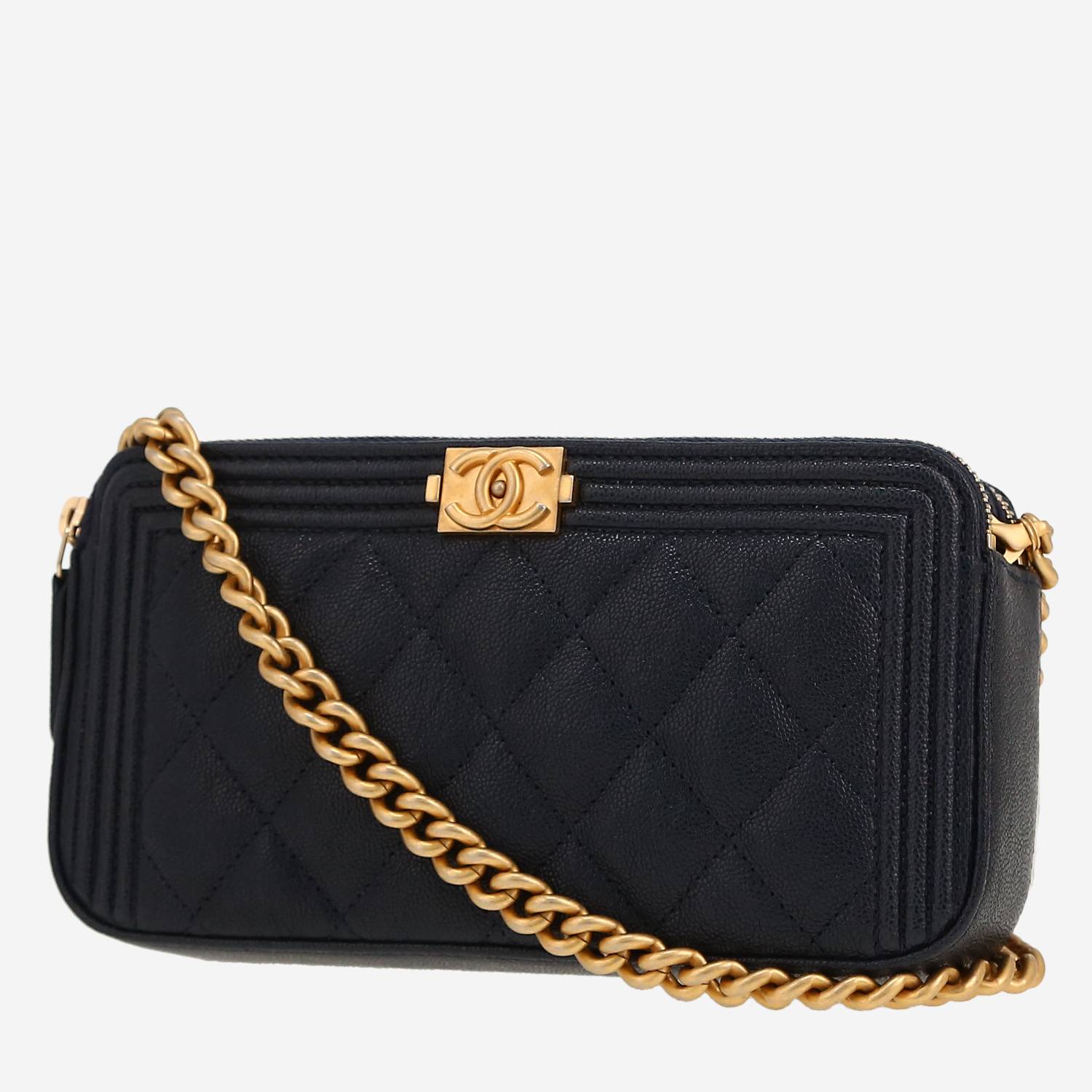 Élégant sac bandoulière Chanel Pochette en cuir grainé matelassé bleu-marine, garniture en métal doré, une anse-chaine amovible en métal doré permettant un porté épaule ou bandoulière.