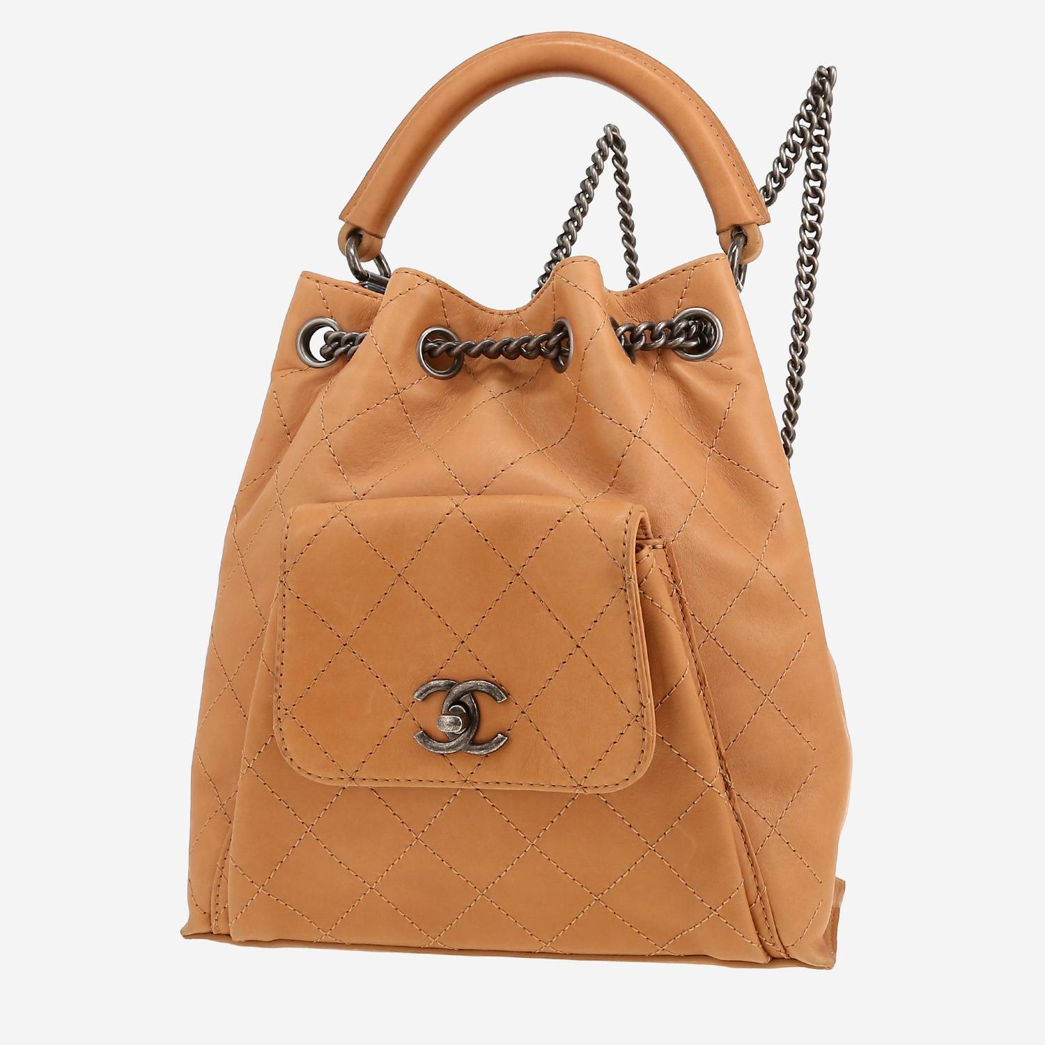 Ravissant sac à dos Chanel en cuir matelassé beige, garniture en métal argenté noirci, poignée simple en cuir beige, une anse-chaine ajustable en métal argenté noirci permettant un porté main ou dos.