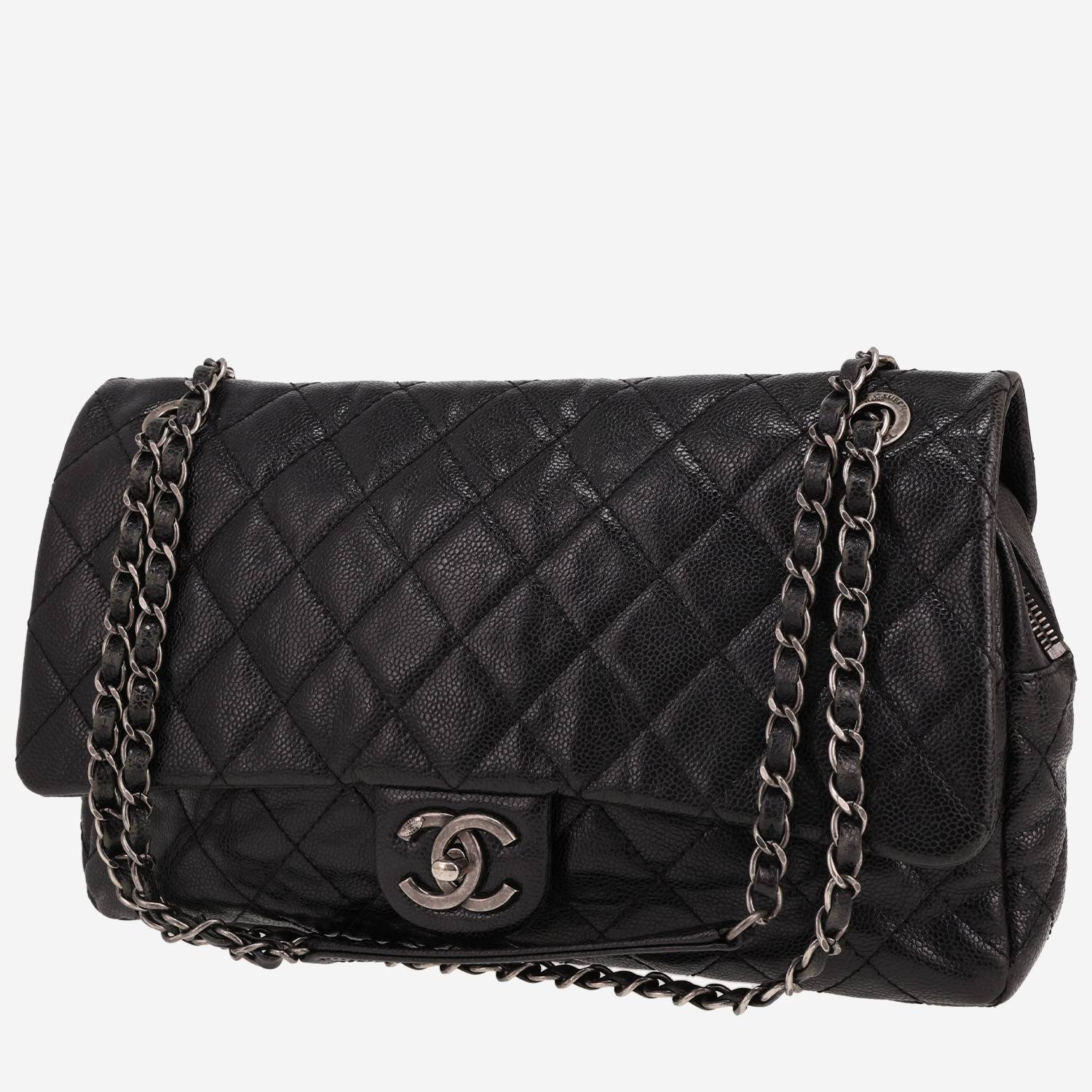 Magnifique sac à main Chanel en cuir grainé matelassé noir, garniture en métal noirci, double anse-chaine transformable en métal noirci entrelacée de cuir noir permettant un porté main ou épaule ou bandoulière.
