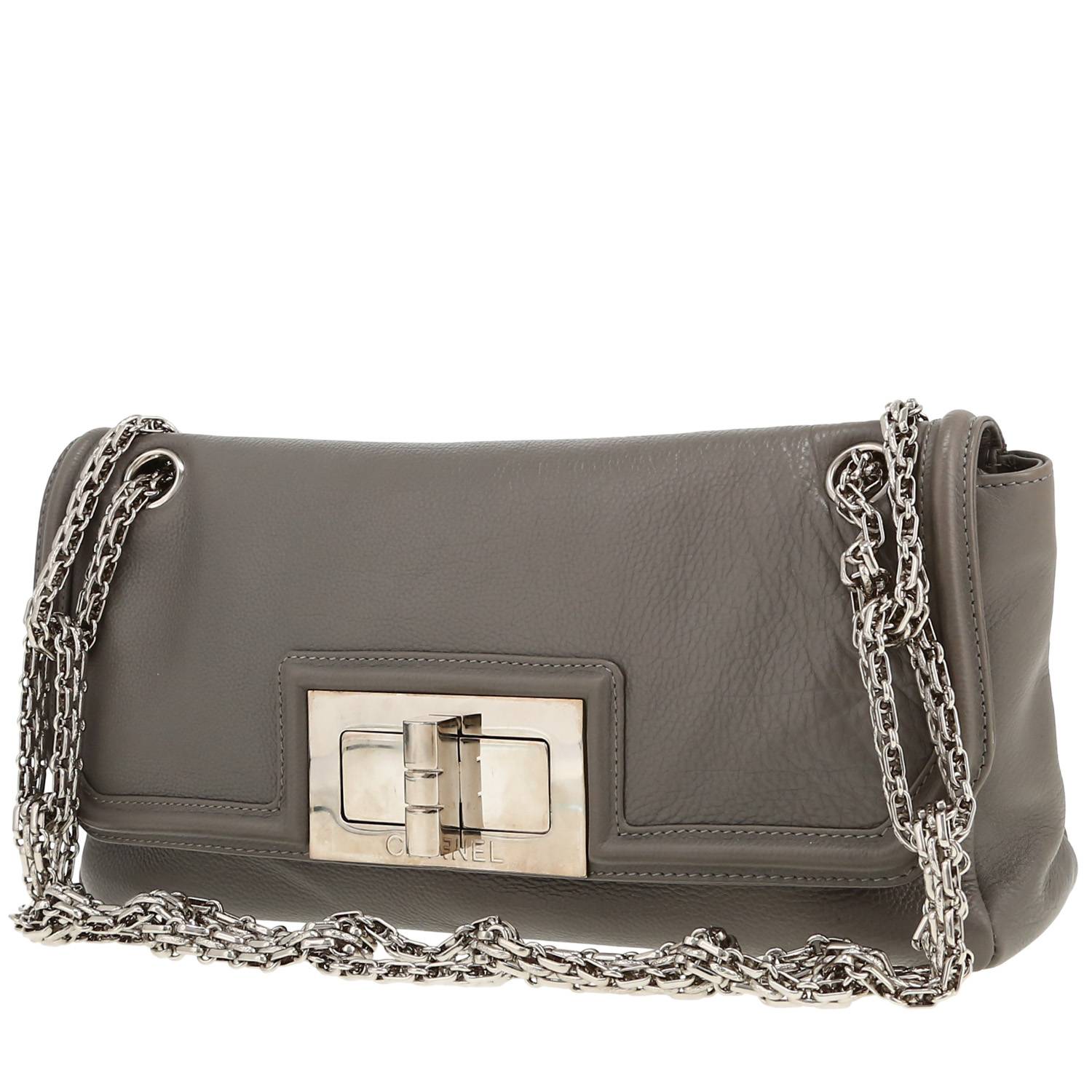 Délicat sac à main Chanel en cuir gris, garniture en métal argenté, une anse simple en métal argenté permettant un porté main ou épaule.