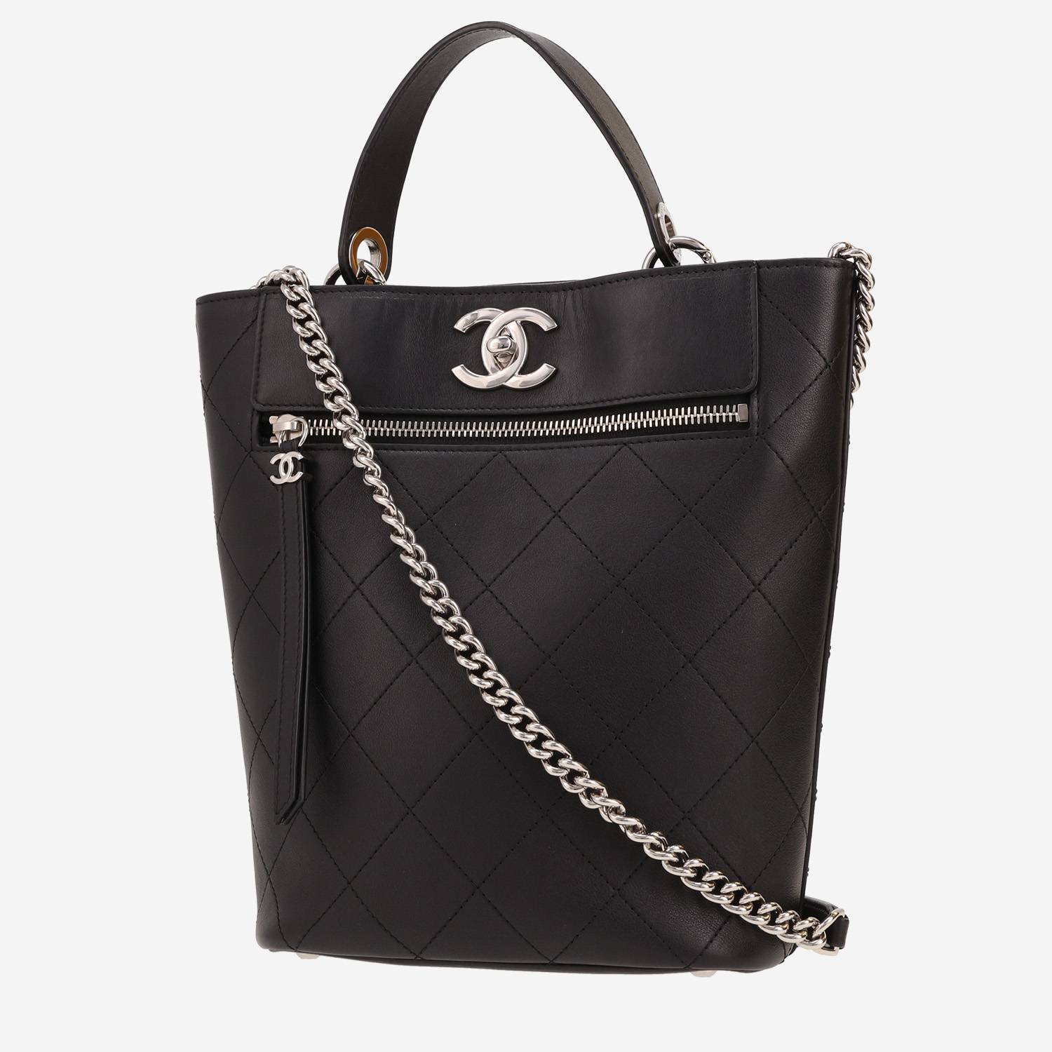 Superbe sac à main Chanel en cuir matelassé noir, garniture en métal argenté, poignée simple en cuir noir, une anse-chaine en métal argenté permettant un porté main ou épaule ou bandoulière.