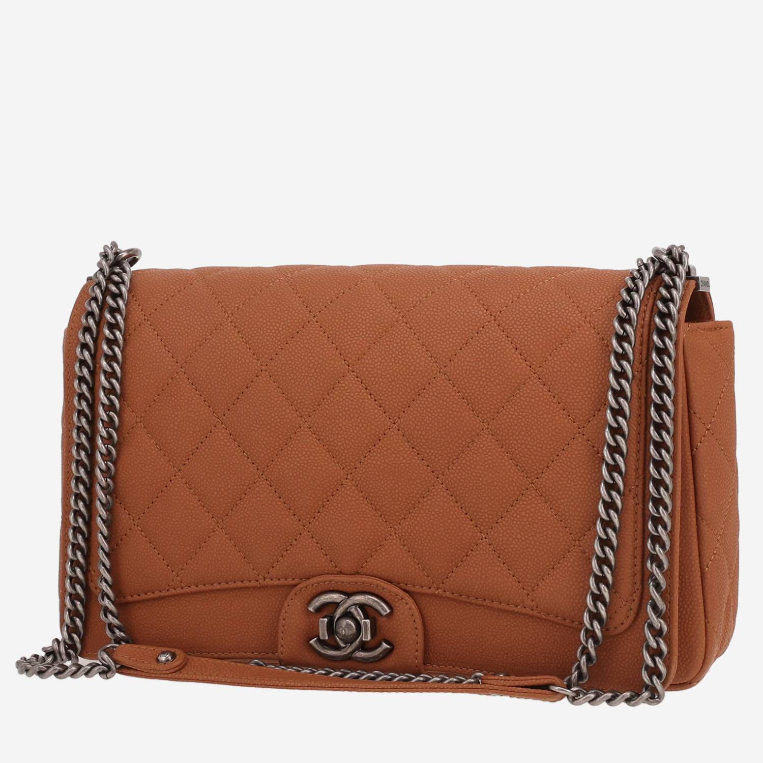 Superbe sac bandoulière Chanel en cuir grainé matelassé gold, garniture en métal argenté noirci, une anse-chaine ajustable en métal argenté noirci.