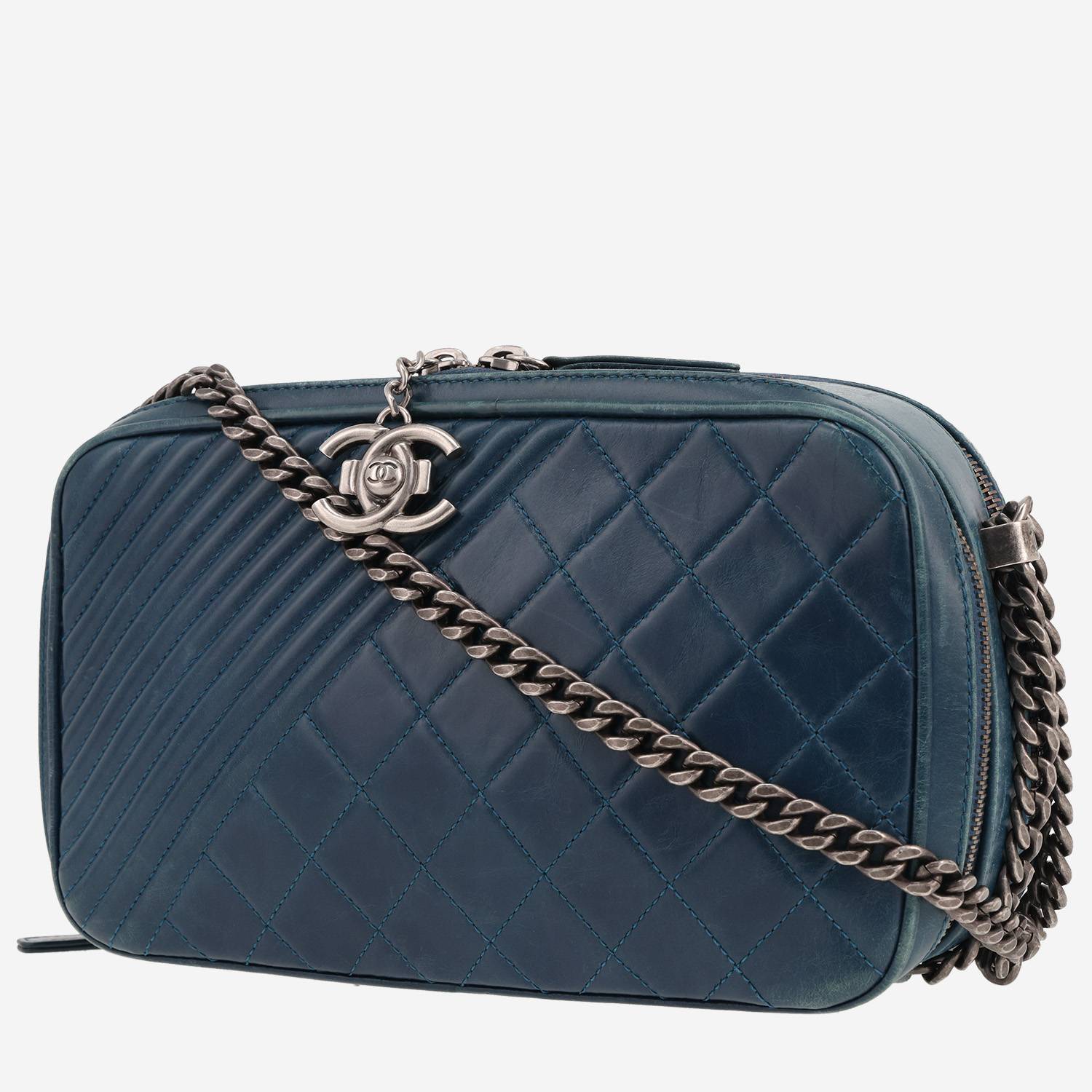 Pratique sac bandoulière Chanel en cuir matelassé bleu, garniture en métal noirci, une anse-chaine en métal noirci permettant un porté épaule ou bandoulière.