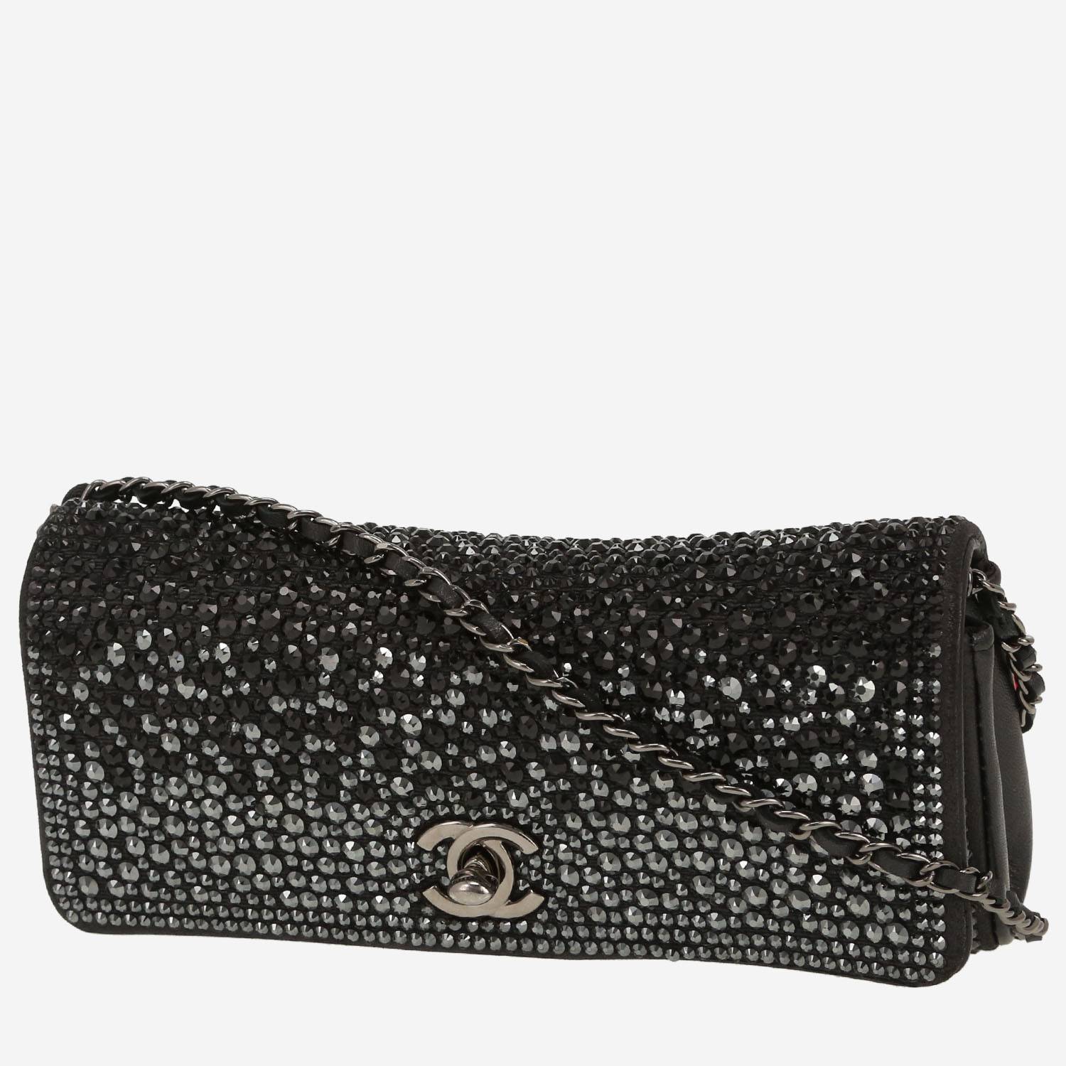 Étonnant sac bandoulière Chanel en toile noir brodé de perles, garniture en métal argenté, une anse bandoulière en métal argenté entrelacée de cuir noir permettant un porté main ou épaule ou bandoulière.