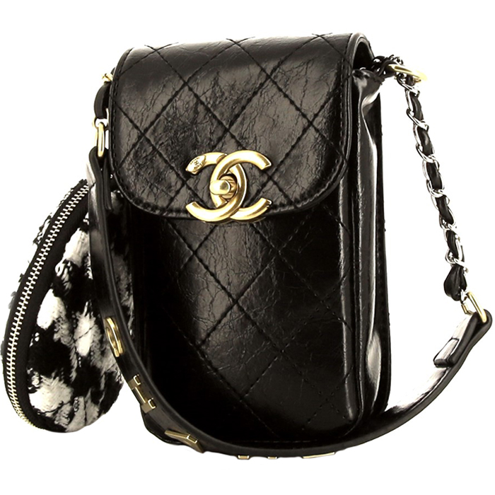 Joli sac bandoulière Chanel mini en toile matelassée noir, garniture en métal doré, une anse bandoulière en métal doré entrelacée de toile noire permettant un porté bandoulière.