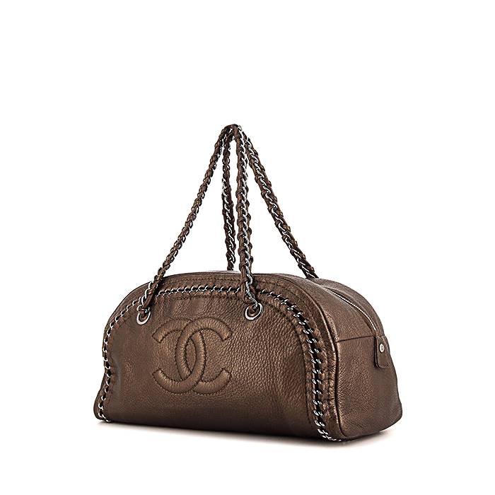 Charmant sac à main Chanel Luxury Line en cuir grainé bronze, garniture en métal argenté noirci, double anse-chaine en métal argenté noirci entrelacée de cuir bronze permettant un porté main ou épaule.