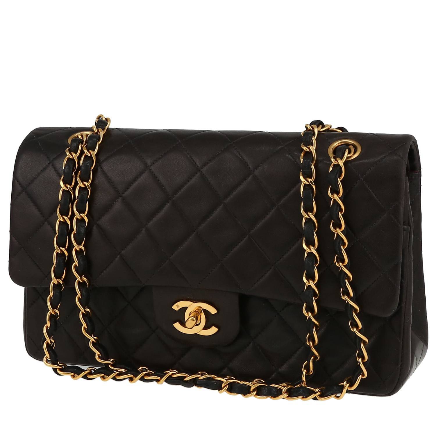 Élégant sac à main Chanel Timeless Classic en cuir matelassé noir, garniture en métal doré, une anse-chaine en métal doré entrelacée de cuir noir permettant un porté main ou épaule.