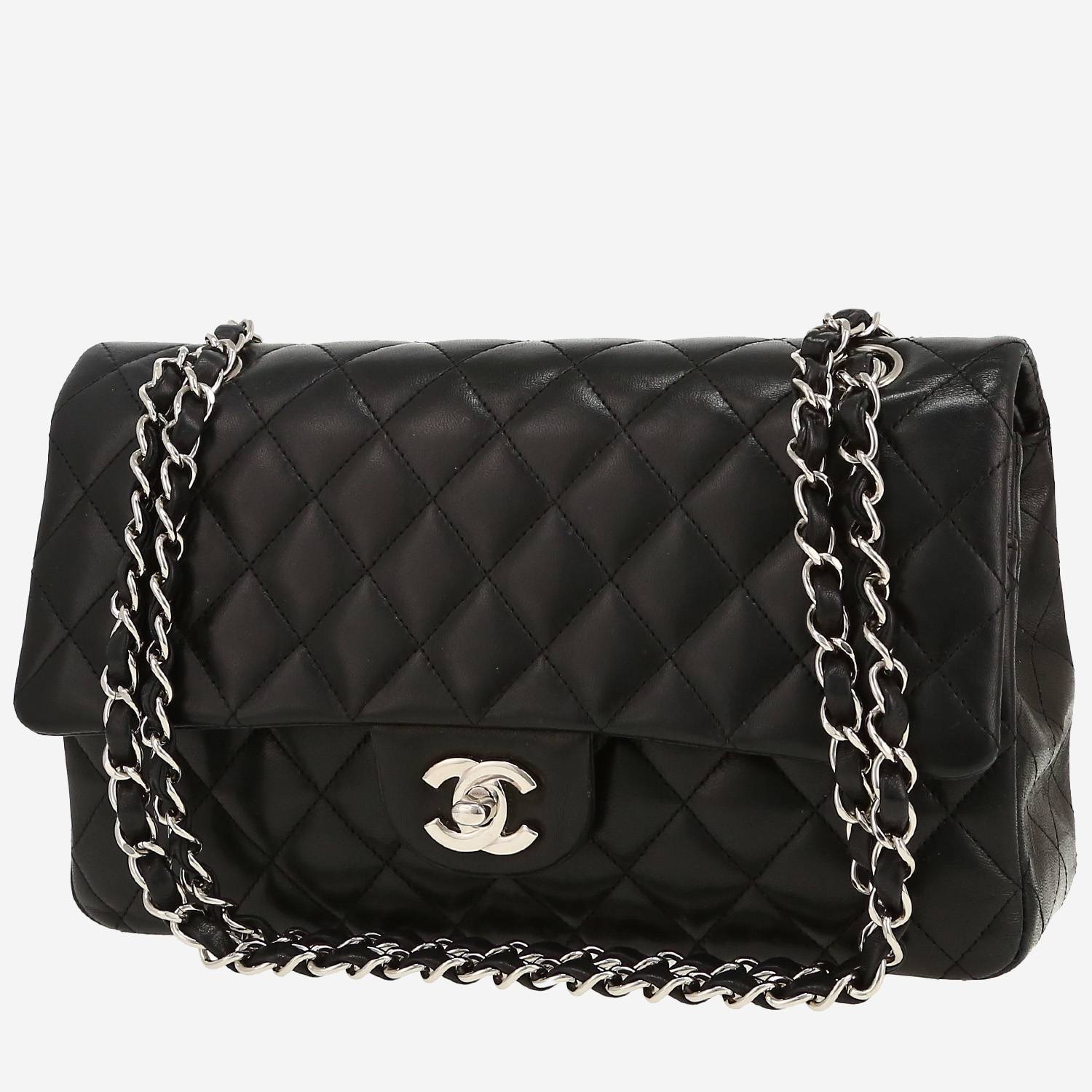 Magnifique sac à main Chanel Timeless Classic en cuir matelassé noir, garniture en métal argenté, une anse-chaine en métal argenté entrelacée de cuir noir permettant un porté main ou épaule.