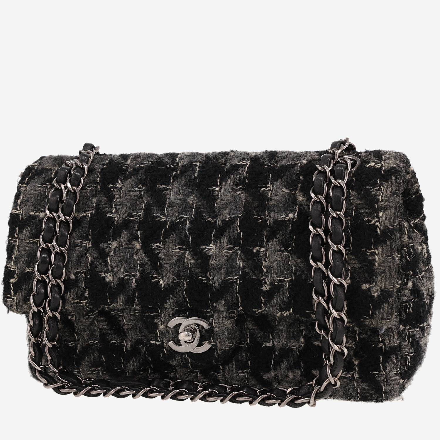 Incontournable sac à main Chanel Timeless Classic en tweed noir et gris, garniture en métal argenté, une anse-chaine transformable en métal argenté entrelacée de cuir noir permettant un porté main ou épaule.