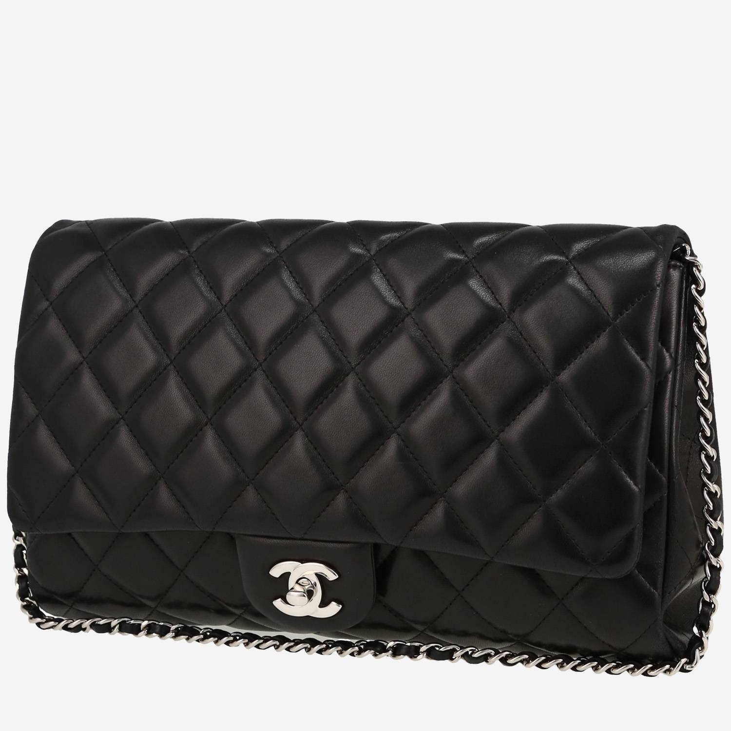 Élégant sac à main Chanel Timeless en cuir grainé matelassé noir, garniture en métal argenté, une anse-chaine en métal argenté entrelacée de cuir noir permettant un porté main ou épaule.
