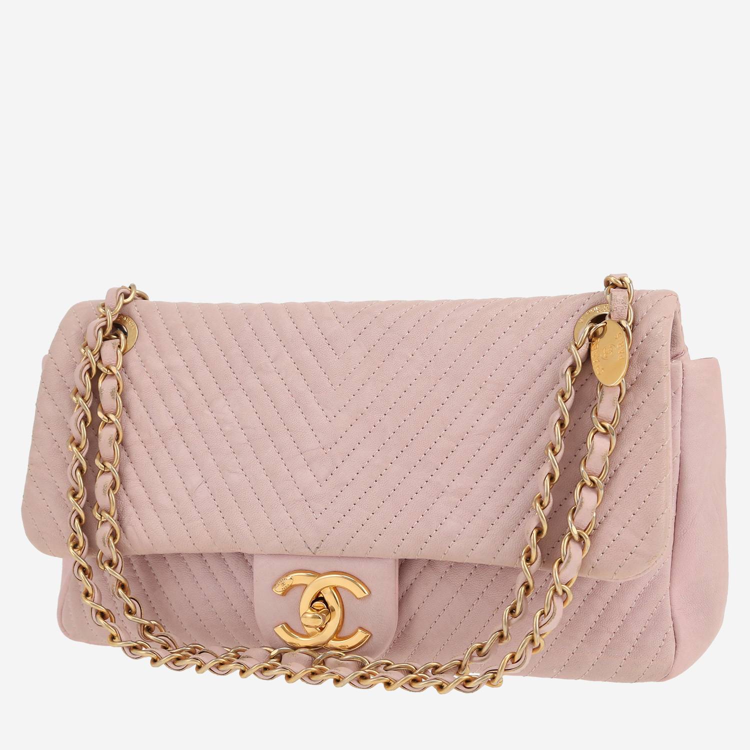 Élégant sac à main Chanel Timeless en cuir matelassé rose-poudre, garniture en métal doré, une anse-chaine en métal doré entrelacée de cuir rose permettant un porté main ou épaule ou bandoulière.