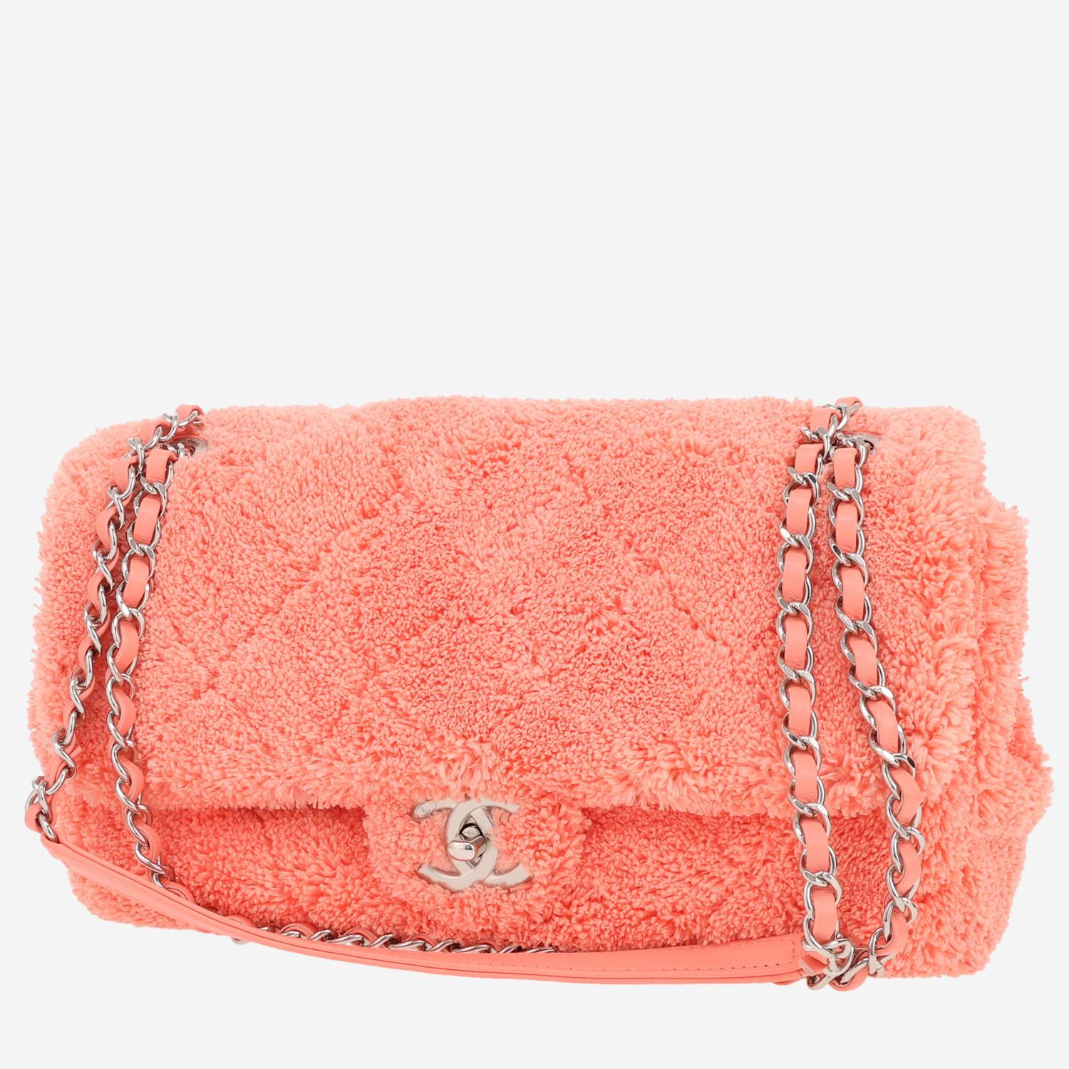 Élégant sac à main Chanel Timeless en tissu-éponge rose, garniture en métal argenté, double anse-chaine en métal argenté entrelacée de cuir rose permettant un porté épaule ou bandoulière.