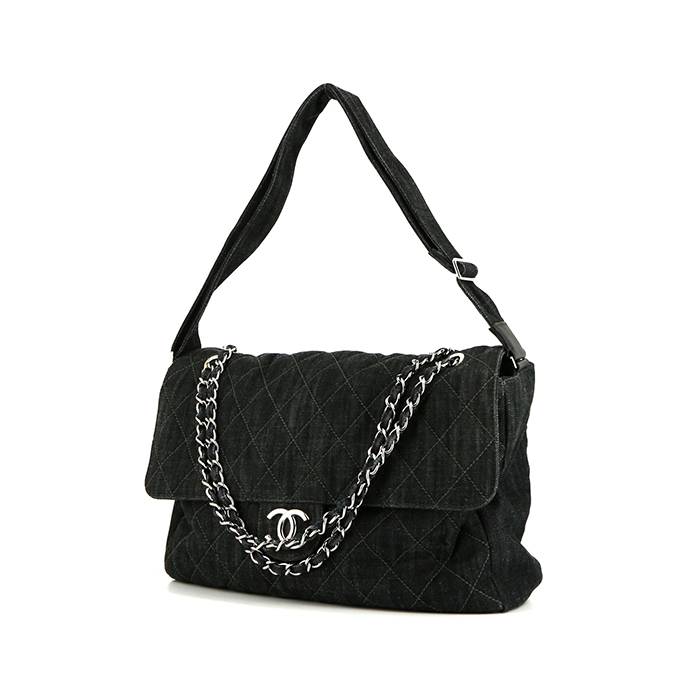 Élégant sac à main Chanel Timeless en toile jersey bleu, garniture en métal argenté, poignée en toile jersey bleue, une anse-chaine en métal argenté entrelacée de toile bleue permettant un porté main ou épaule ou bandoulière.