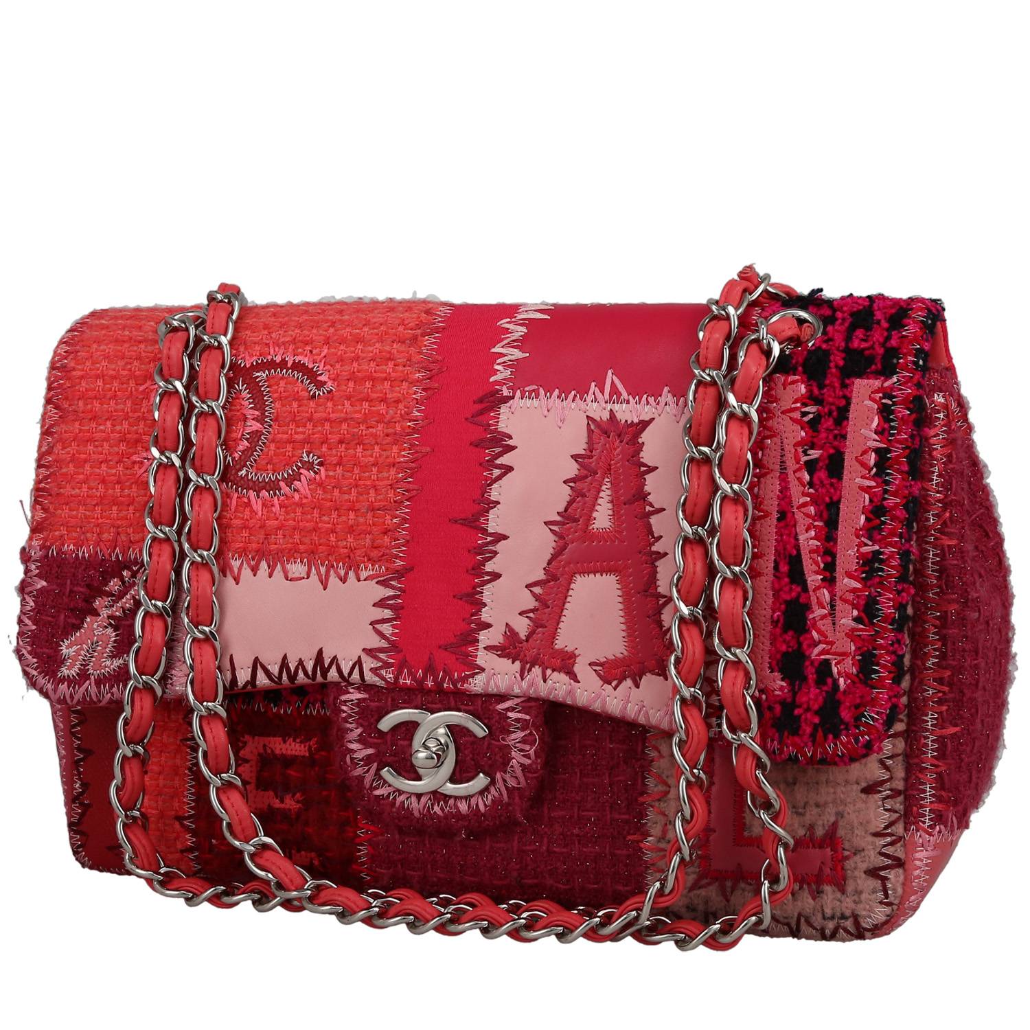 Sublime sac à main Chanel Timeless en tweed rose et rouge à motif de patchwork et cuir rose, garniture en métal argenté, une anse-chaine transformable en métal argenté entrelacée de cuir rose permettant un porté main ou épaule ou bandoulière.